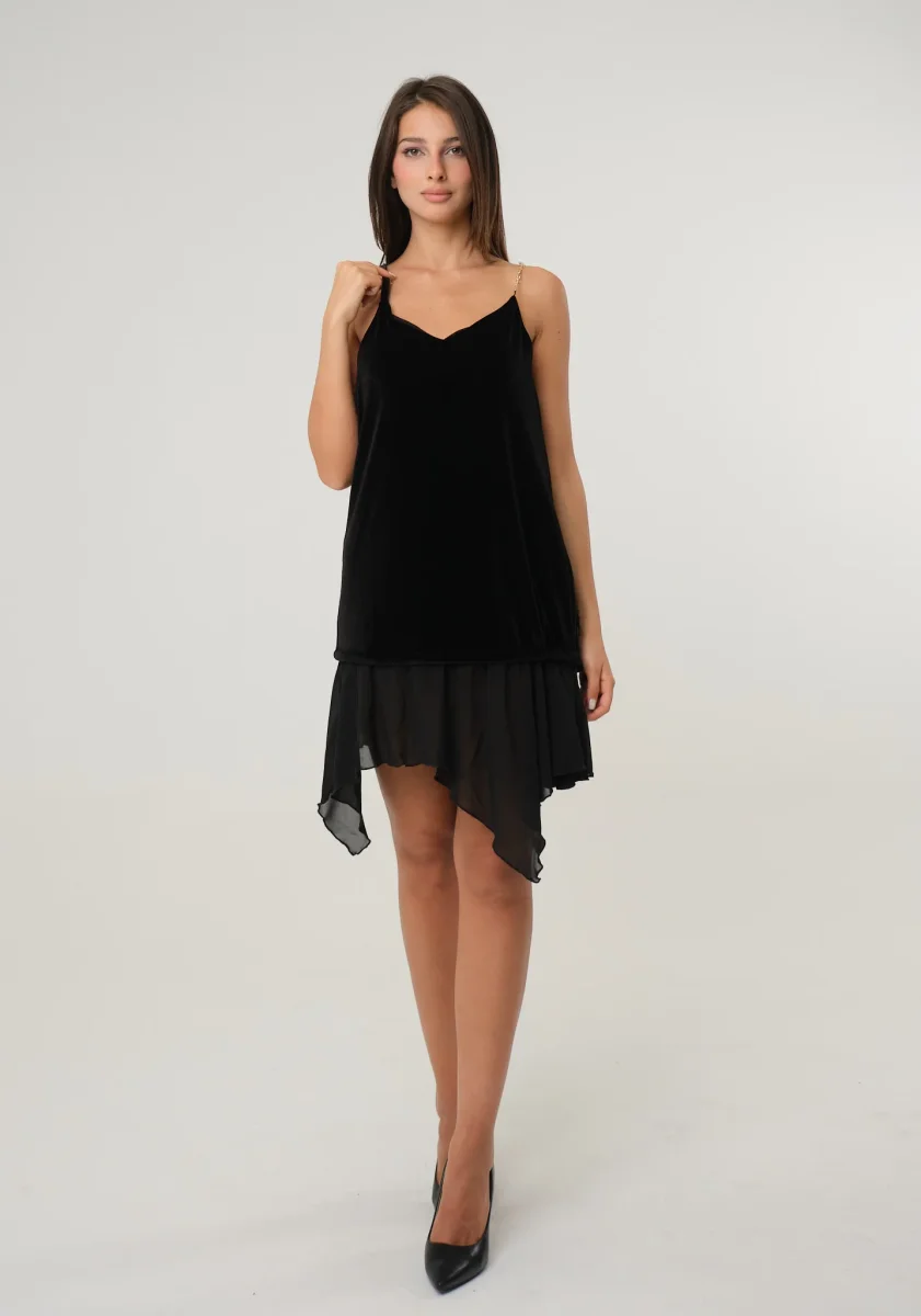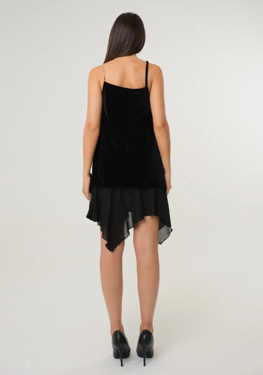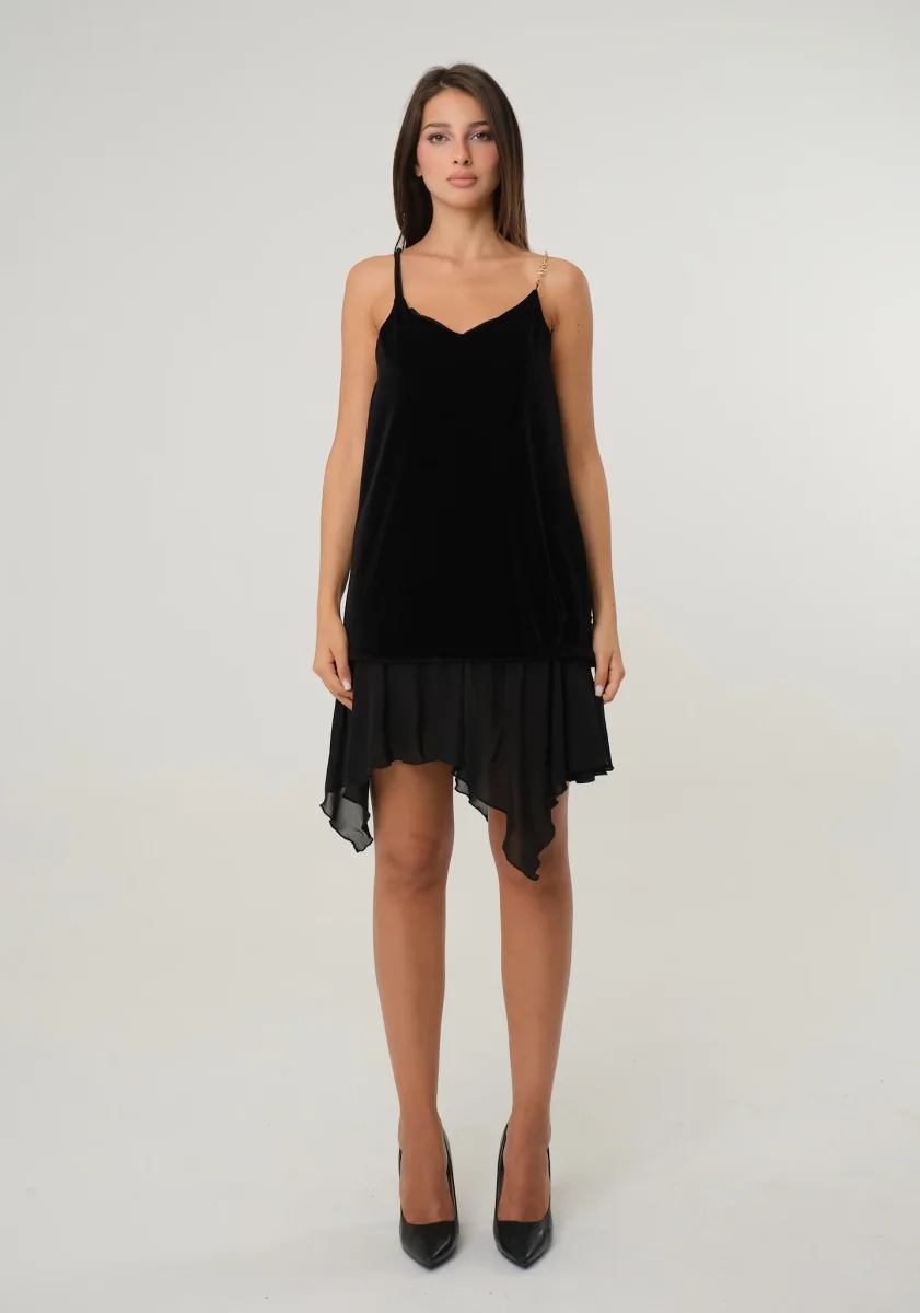 Abito a canotta in ciniglia e georgette con bretella gioiello in catena, fondo a fazzoletto
