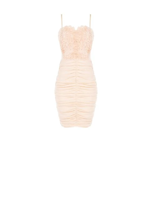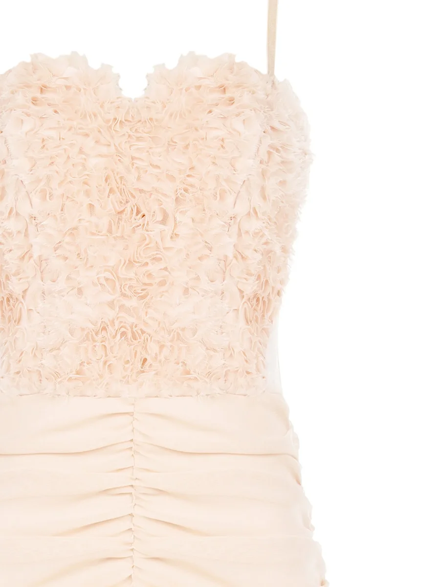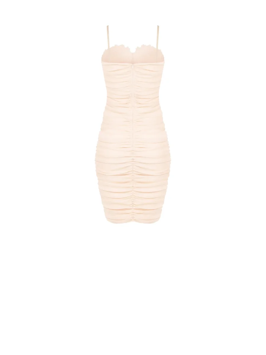 Abito “Blush Whisper”. Abito lunghette in tessuto fluido con scollo drappeggiato d’avanti e scollatura profonda sul dietro
