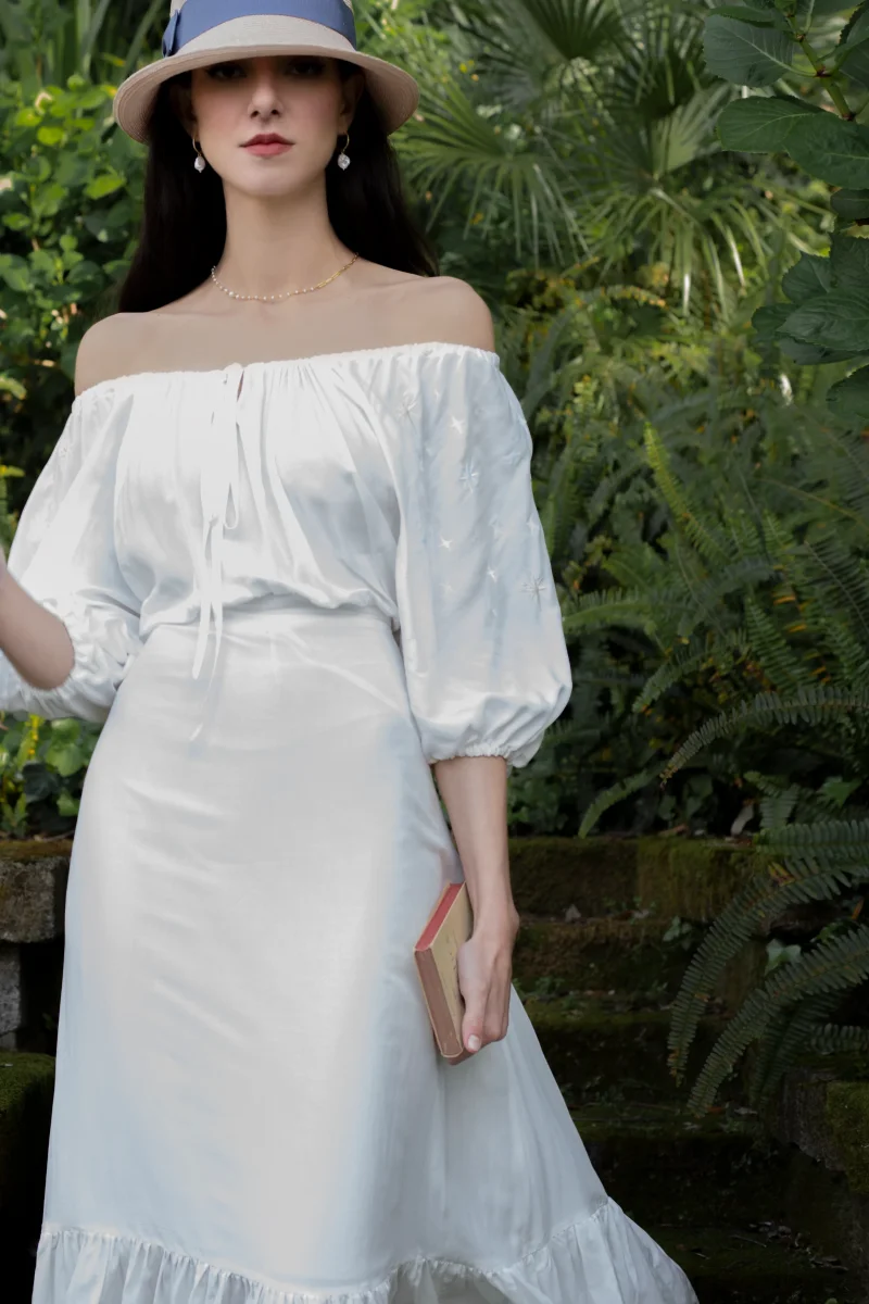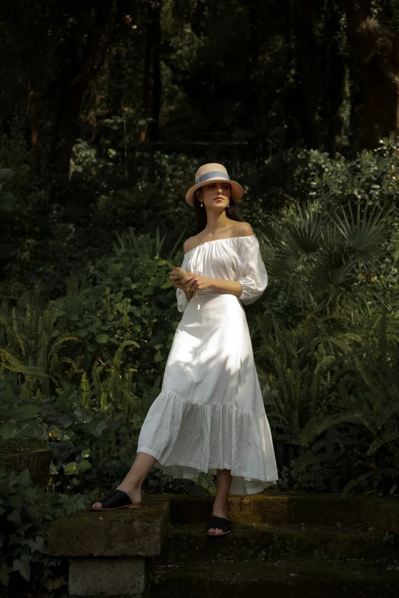 Bellissimo abito lungo con spalle scivolate, cade morbido in vita e ha voluminosissime maniche ricamate a mano tono su tono. Ha una vestibilitร molto versatile che si adatta alle forme del corpo in maniera morbida e aggraziata. La taglia รจ unica.Il tessuto di fibra di bambรน grazie alle sue proprietร e benefici รจ adatto a stare a diretto contatto con la pelle. Ha innumerevoli capacitร tra cui assorbire l’umiditร , essere naturalmente antibatterico, e rendere gli indumenti altamente traspiranti donando cosรฌ freschezza per lungo tempo.
