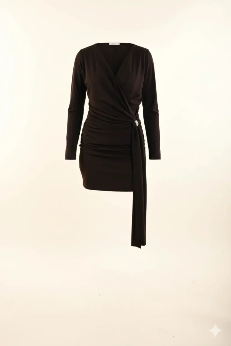 Abito elegante a maniche lunghe dal design raffinato e femminile. Caratterizzato da scollo a V incrociato e drappeggio laterale, รจ impreziosito da un dettaglio gioiello che sottolinea il punto vita con stile sofisticato. Un capo versatile che valorizza la silhouette, perfetto per occasioni speciali, serate eleganti o eventi in cui si desidera un look distintivo e di tendenza. Ideale per negozi che vogliono offrire ai propri clienti abiti femminili dal carattere contemporaneo.