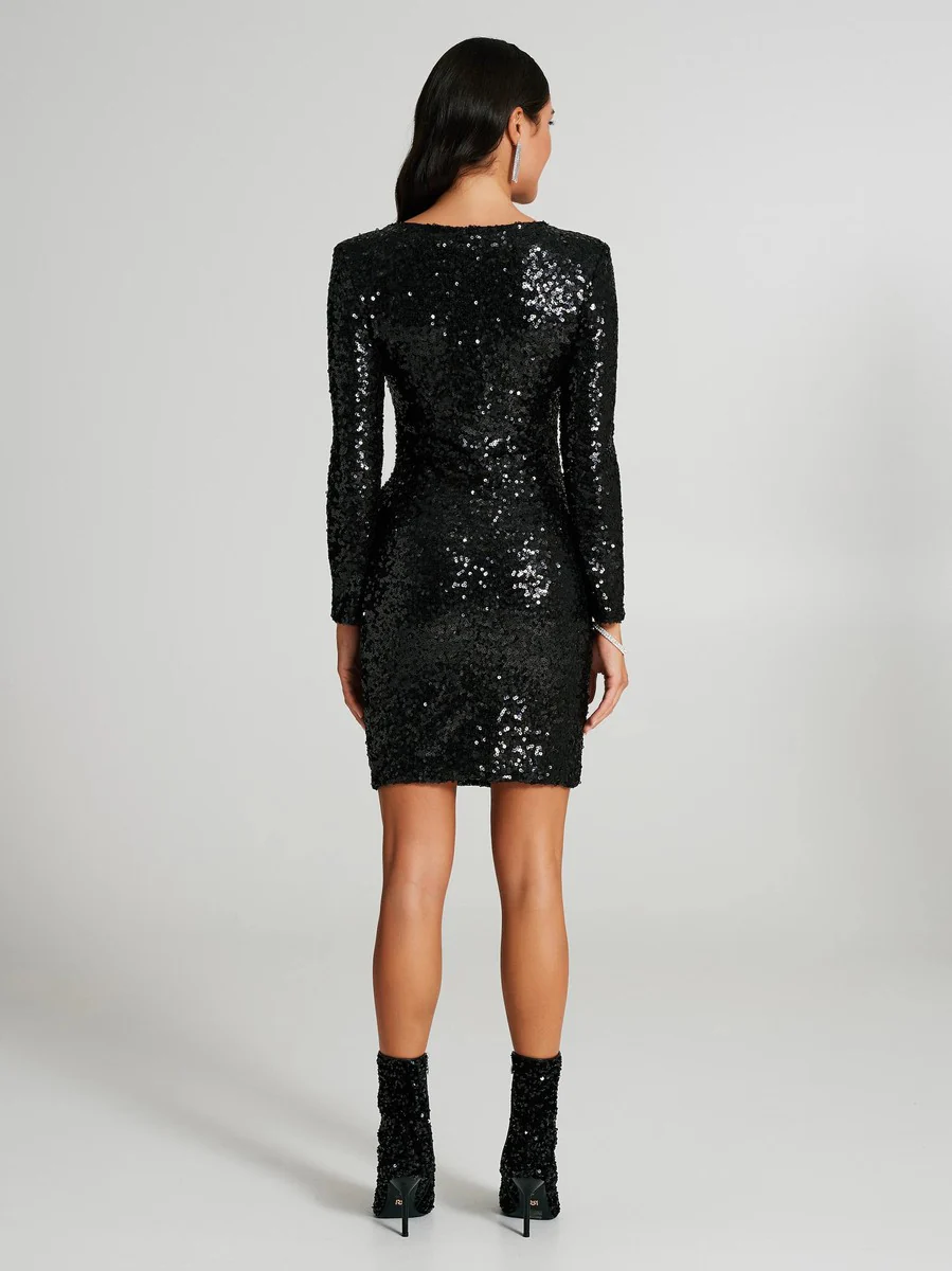 Abito corto modello tubino realizzato in tessuto elasticizzato tempestato di paillettes. L’abito ha il girocollo, maniche lunghe e un moderno cut-out diagonale sulla parte davanti, che scopre l’incarnato. Abitino super luccicante per i tuoi party glam. Il capo รจ interamente made in Italy. La modella รจ alta 1,74 ed indossa la taglia S.