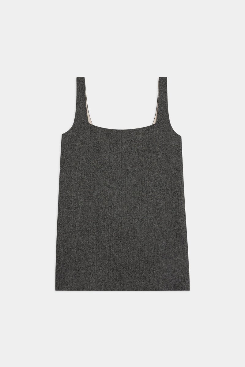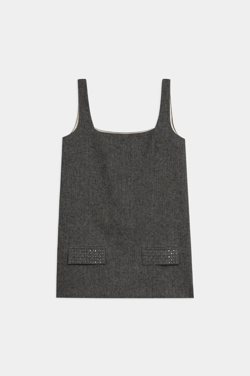 Abito corto senza maniche in tessuto tramato con scollo quadrato. Caratterizzato da due tasche frontali arricchite da applicazioni di micro borchie. Linea dritta dal design minimal e contemporaneo.