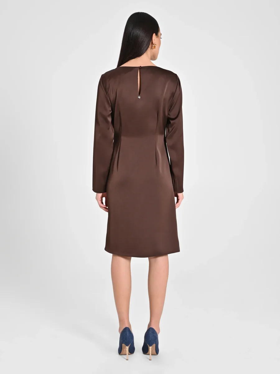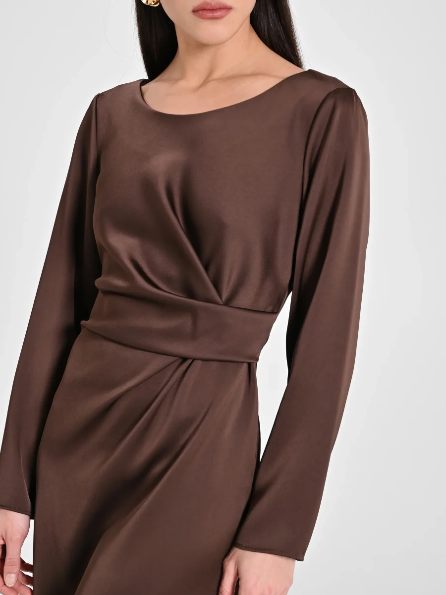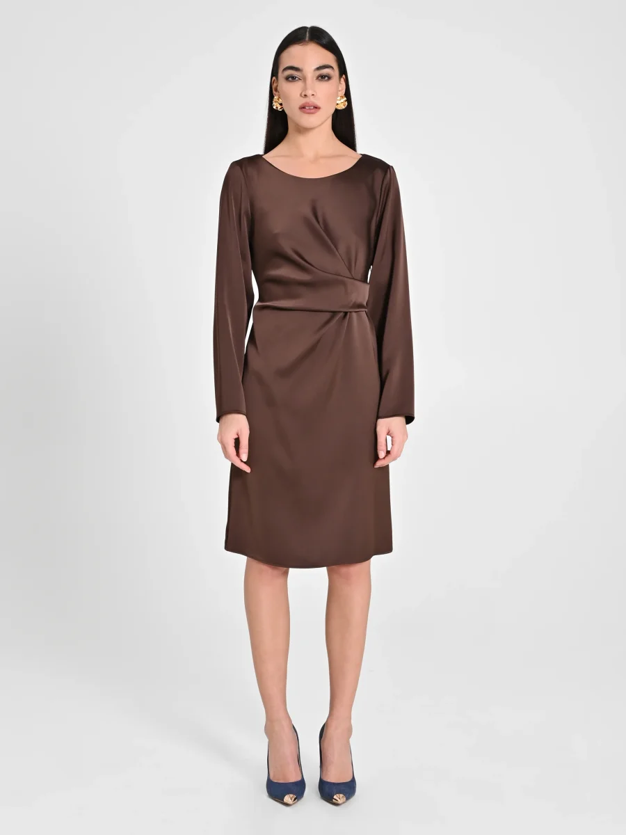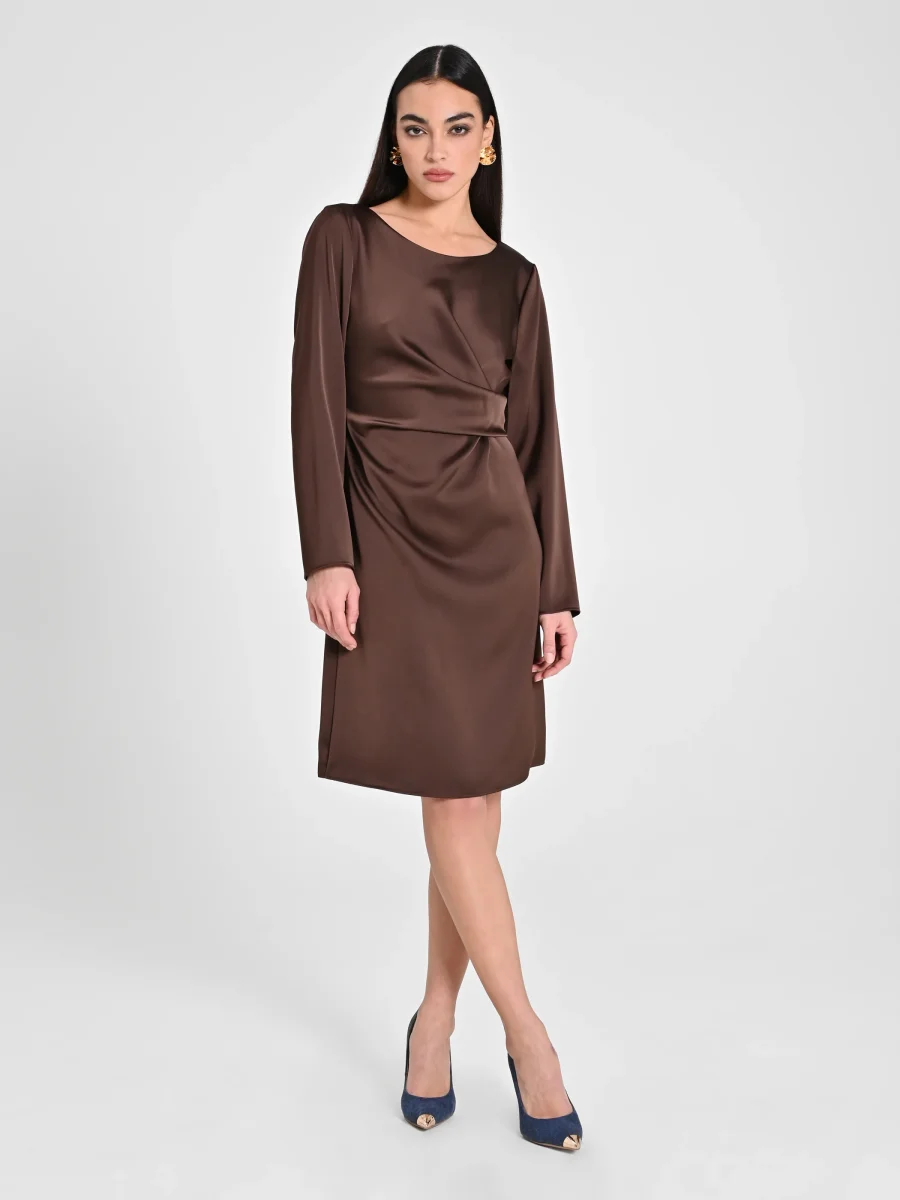 Abito lunghezza al ginocchio, realizzato in raso. L’abito รจ decorato sul fianco da un pannello drappeggiato, che valorizza la silhouette. Manica lunga, scollo tondo. Chiusura posteriore tramite bottoncino posteriore e zip laterale. Completa il tuo outfit e abbina all’abito il pannello della nostra collezione di accessori e calzature. Il capo รจ interamente realizzato in Italia. La modella รจ alta 1,80 m ed indossa la taglia S.