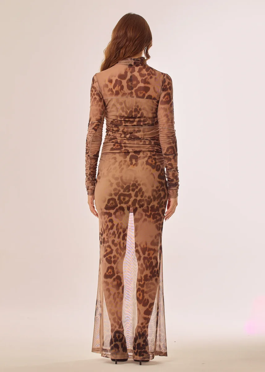 Abito lungo animalier a maniche lunghe con arricci laterali