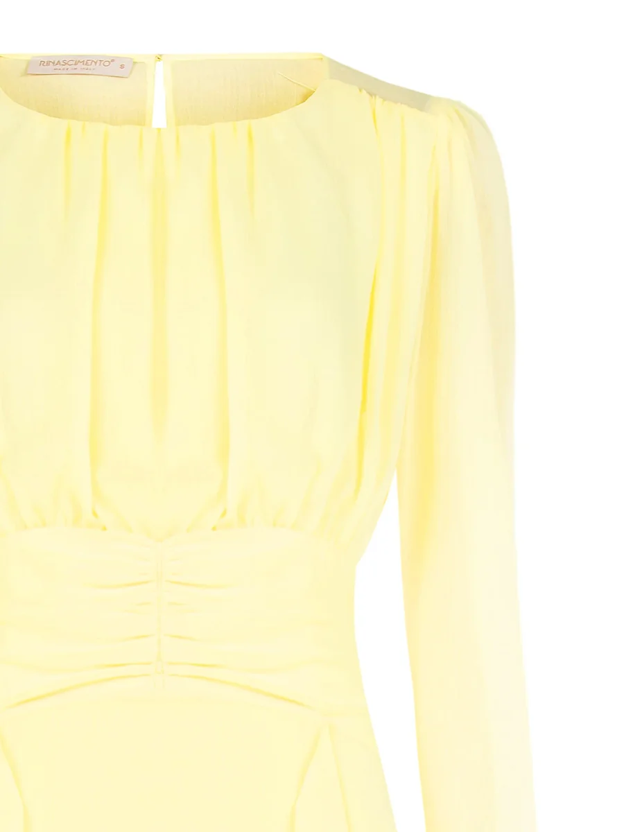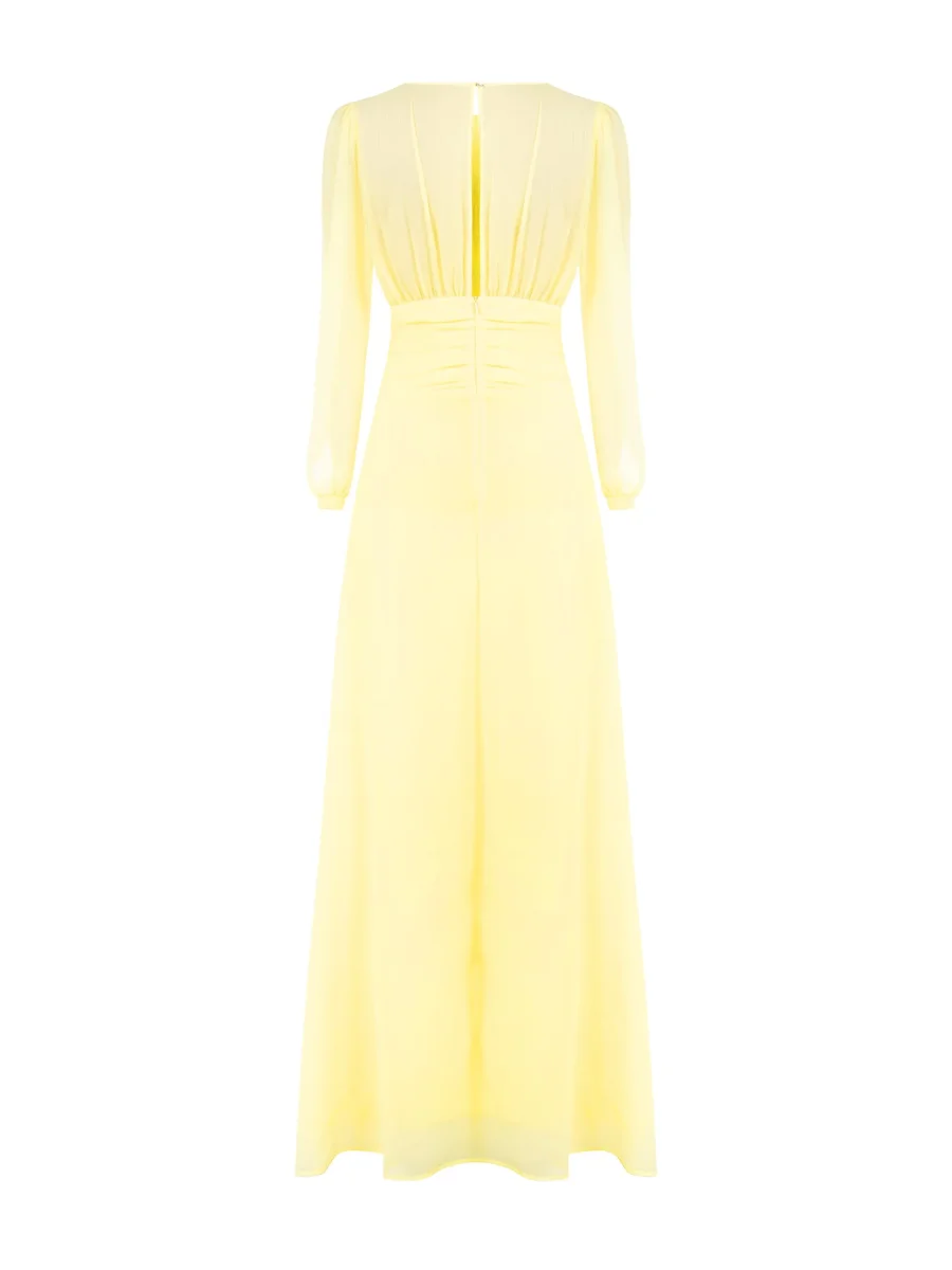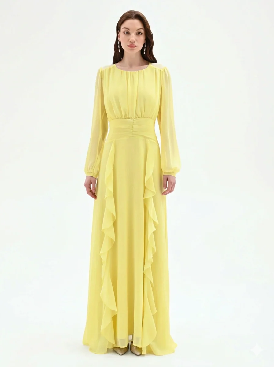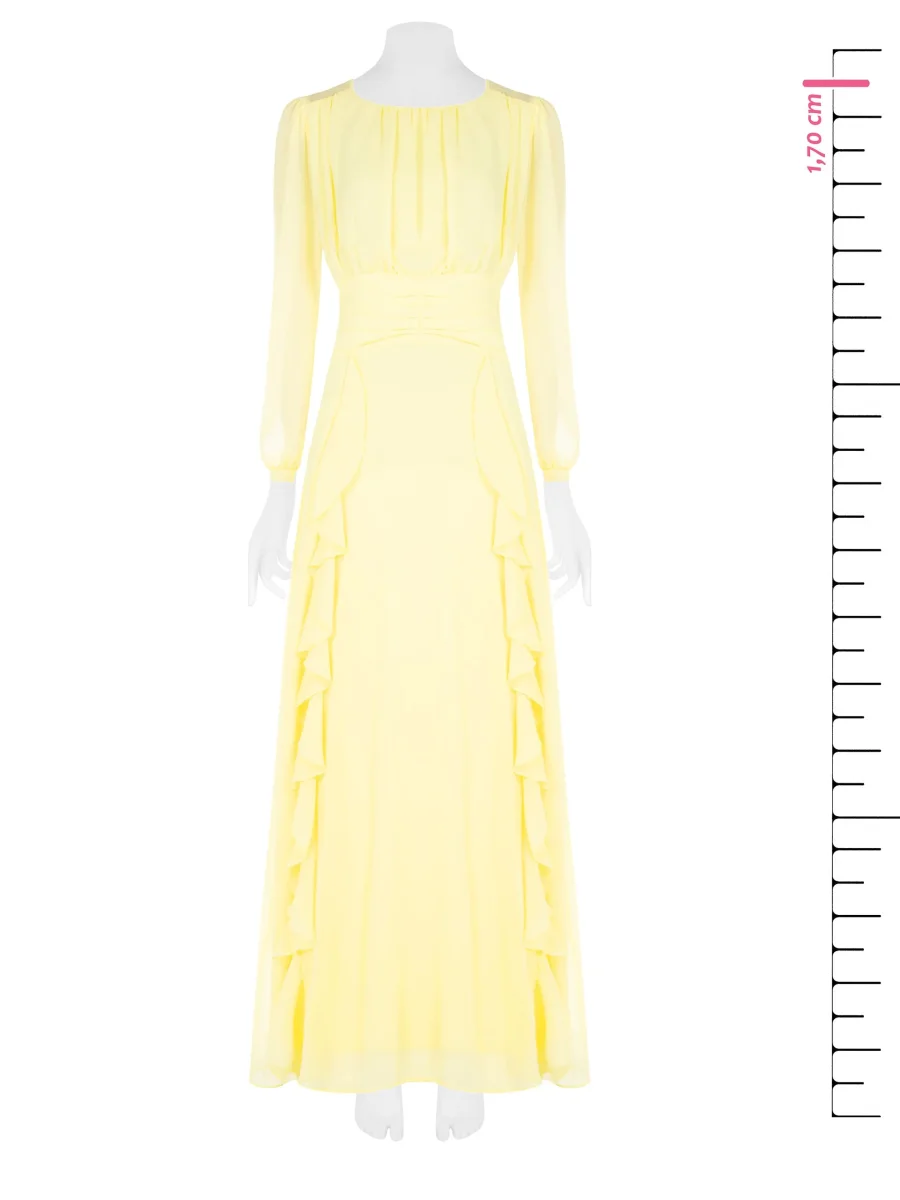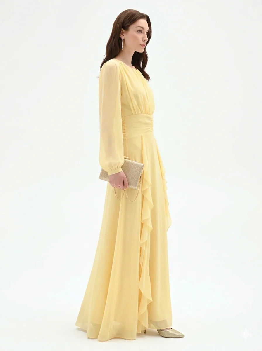 Un soffio di eleganza e romanticismo: l’abito lungo รจ un’ode alla femminilitร , ideale per lasciare il segno durante un evento speciale con uno stile unico e ricercato. Realizzato in georgette impalpabile, questo modello scivola leggero sulla figura. Il design presenta un corpetto raffinato, definito da morbide pieghe verticali e maniche lunghe trasparenti che creano un delicato gioco di vedo-non-vedo. L’ampia fascia arricciata in vita sottolinea con grazia la silhouette, creando un equilibrio di volumi. La gonna scende fluida fino a terra, animata da due importanti volant verticali che partono dai fianchi e creano un suggestivo effetto a cascata, donando movimento e un’allure sofisticata a ogni passo. La chiusura posteriore garantisce una vestibilitร perfetta, mantenendo la pulizia delle linee.