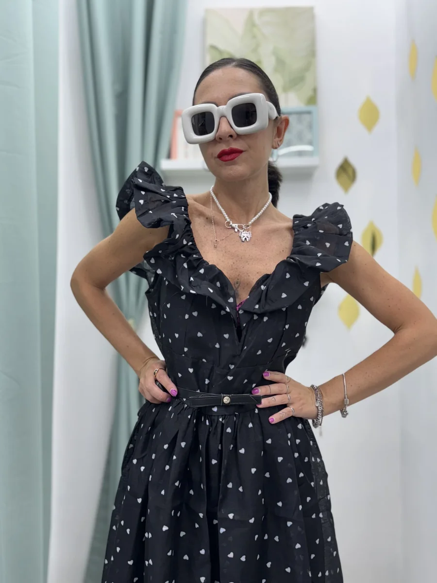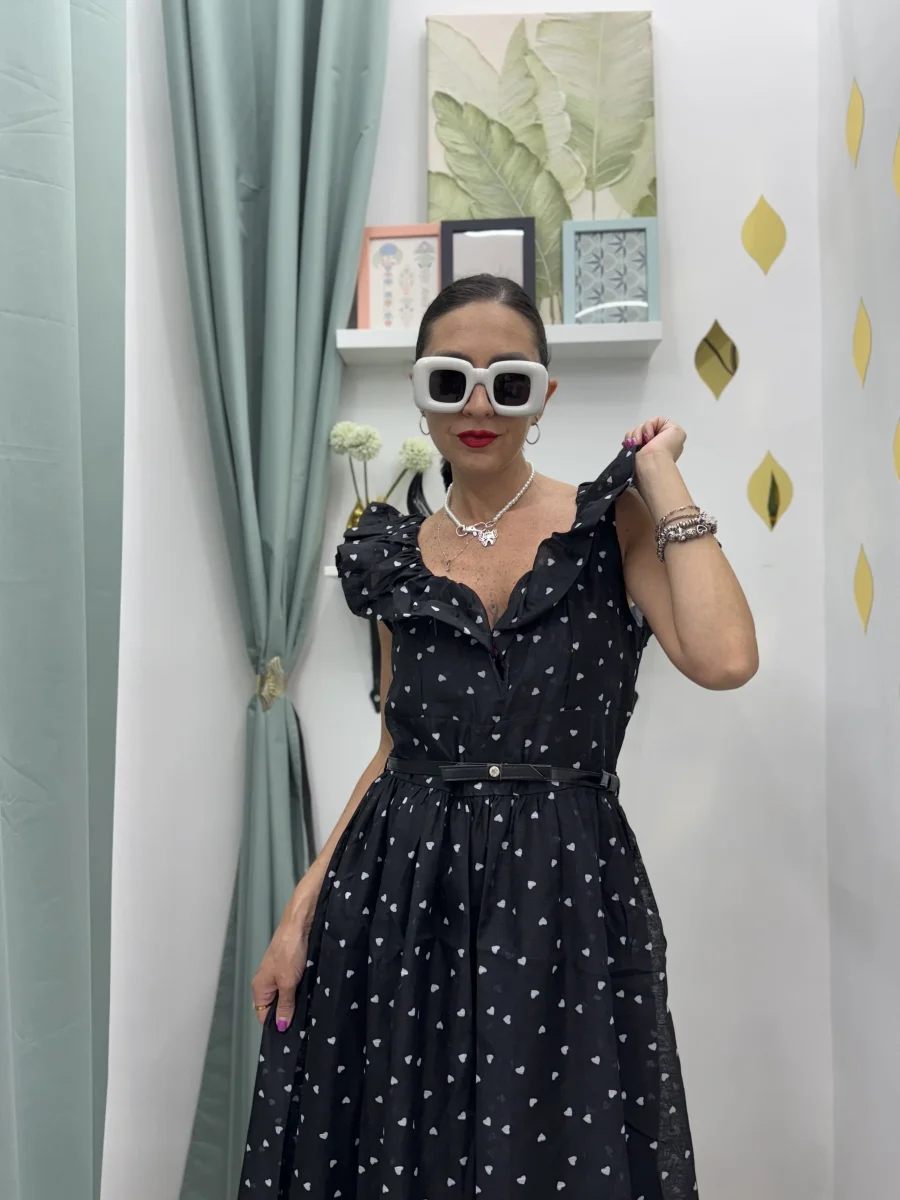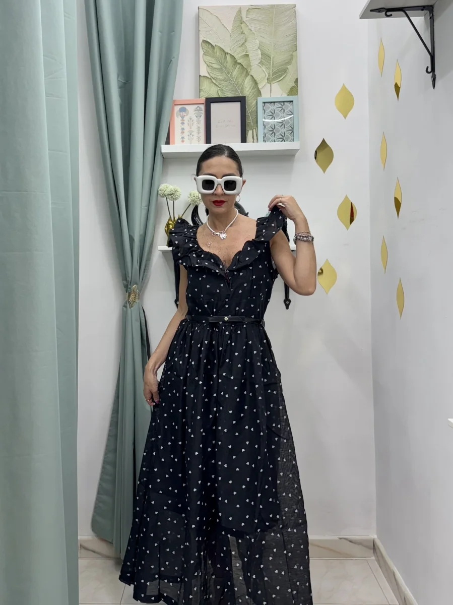 Abito Lungo Elegante e Casual nero con Cuoricini bianchi– Scollatura a Cuore e Volant