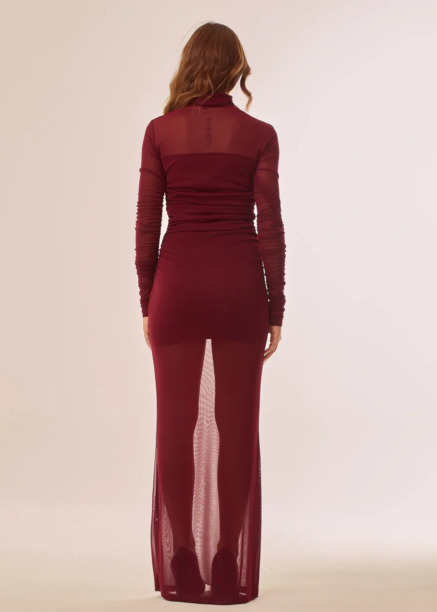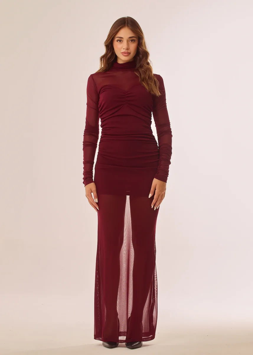 Abito lungo in mesh a maniche lunghe e arricci laterali