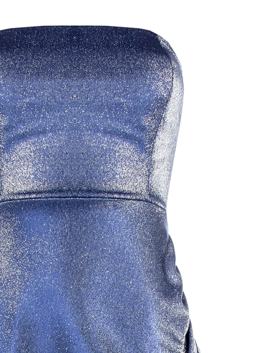 Abito “Blue Stardust”. Abito corto in paillettes blu, con piume decorative e senza maniche.