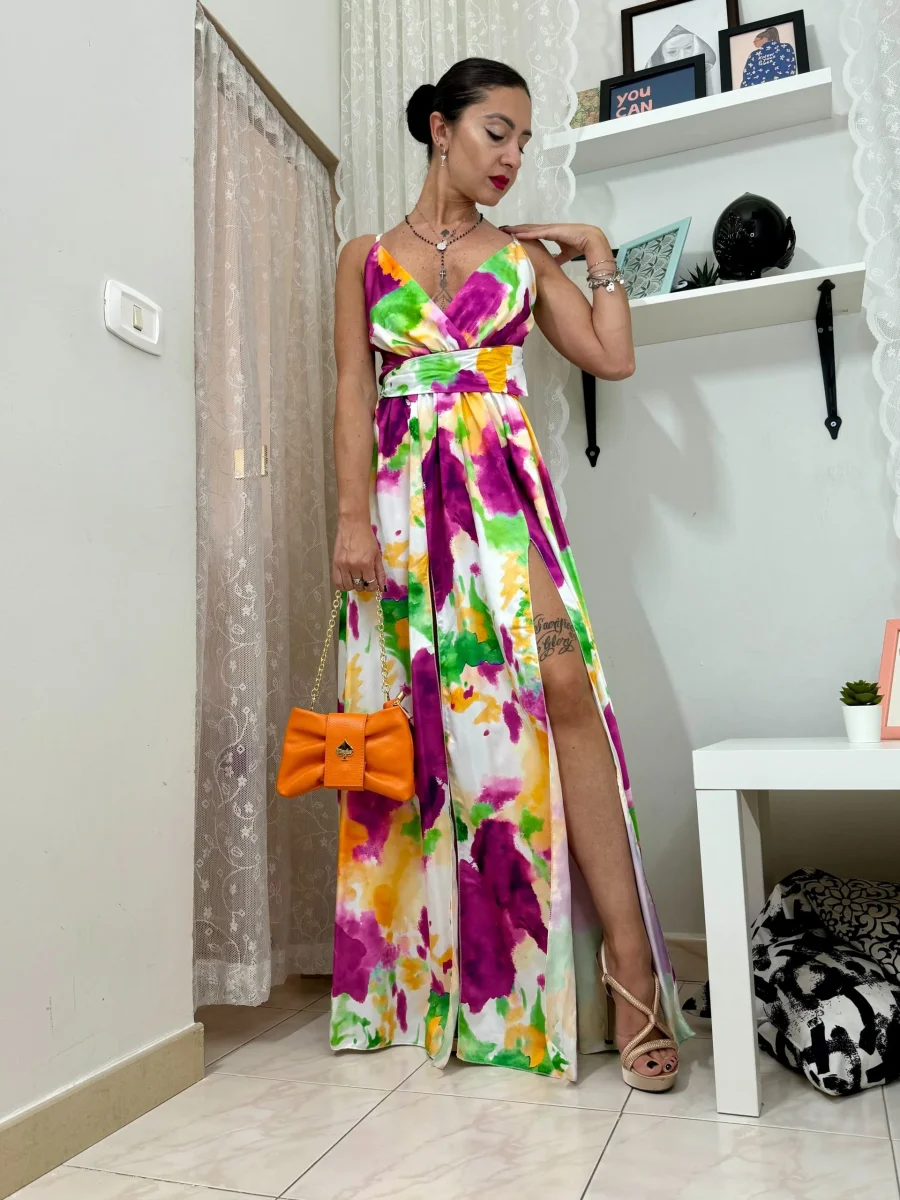 Abito lungo multicolore con doppio spacco frontale e fusciacca