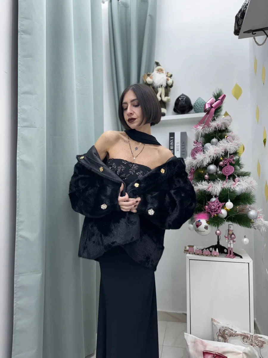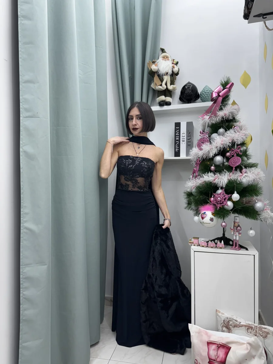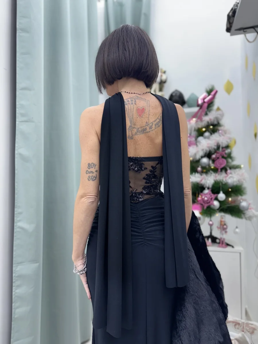 Il modello è completato da una stola nera semplice e lunga, perfetta da abbinare all’abito per creare un look elegante e completo. Grazie al tessuto elasticizzato, l’abito veste comodamente e segue le linee del corpo senza stringere, garantendo libertà di movimento e comfort anche durante le serate più lunghe.