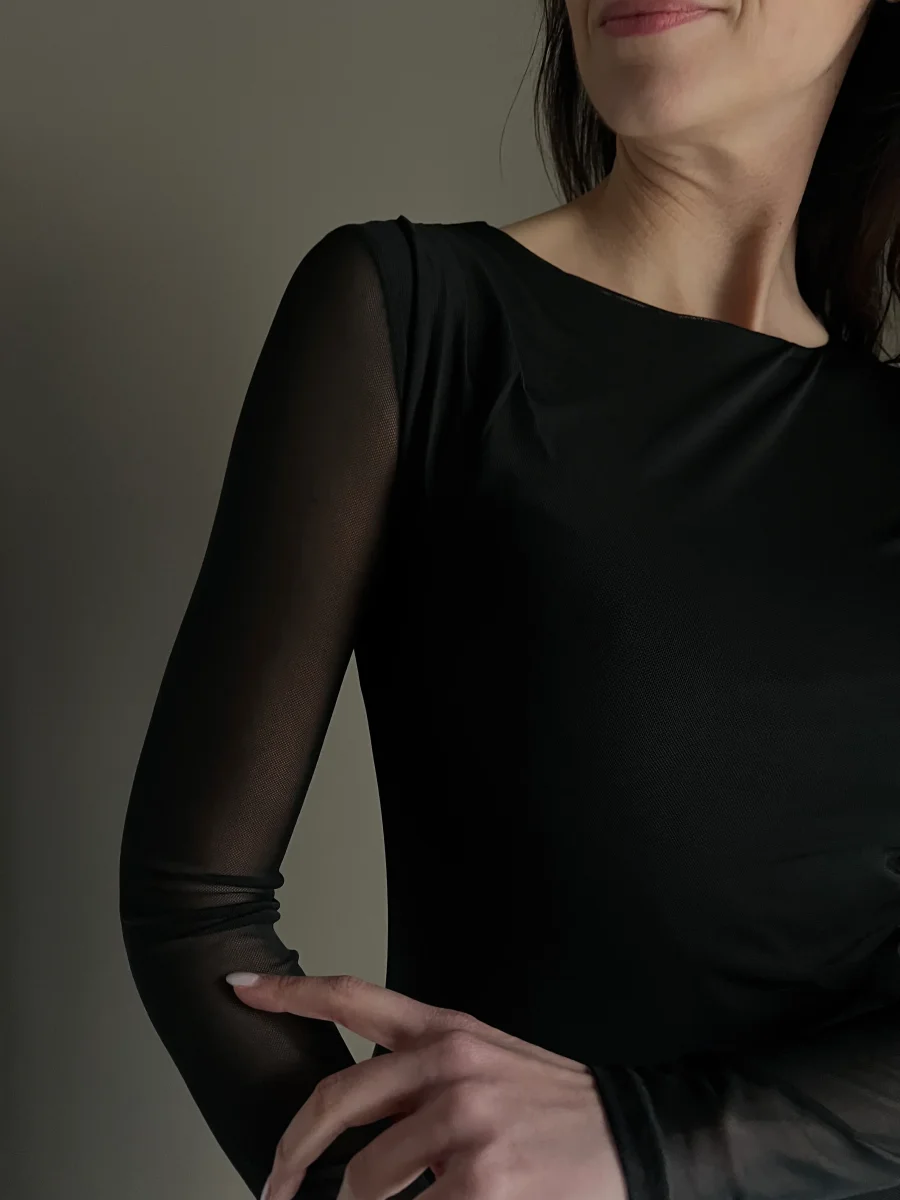 โข Tulle High-Tech: La texture รจ soffice al tatto e altamente elasticizzata, garantendo una vestibilitร impeccabile e una totale libertร di movimento.
