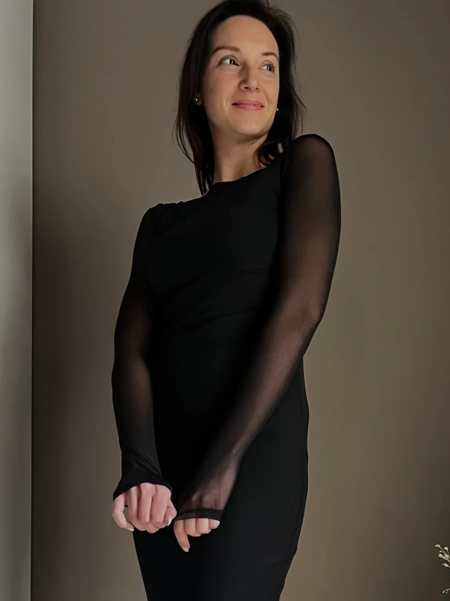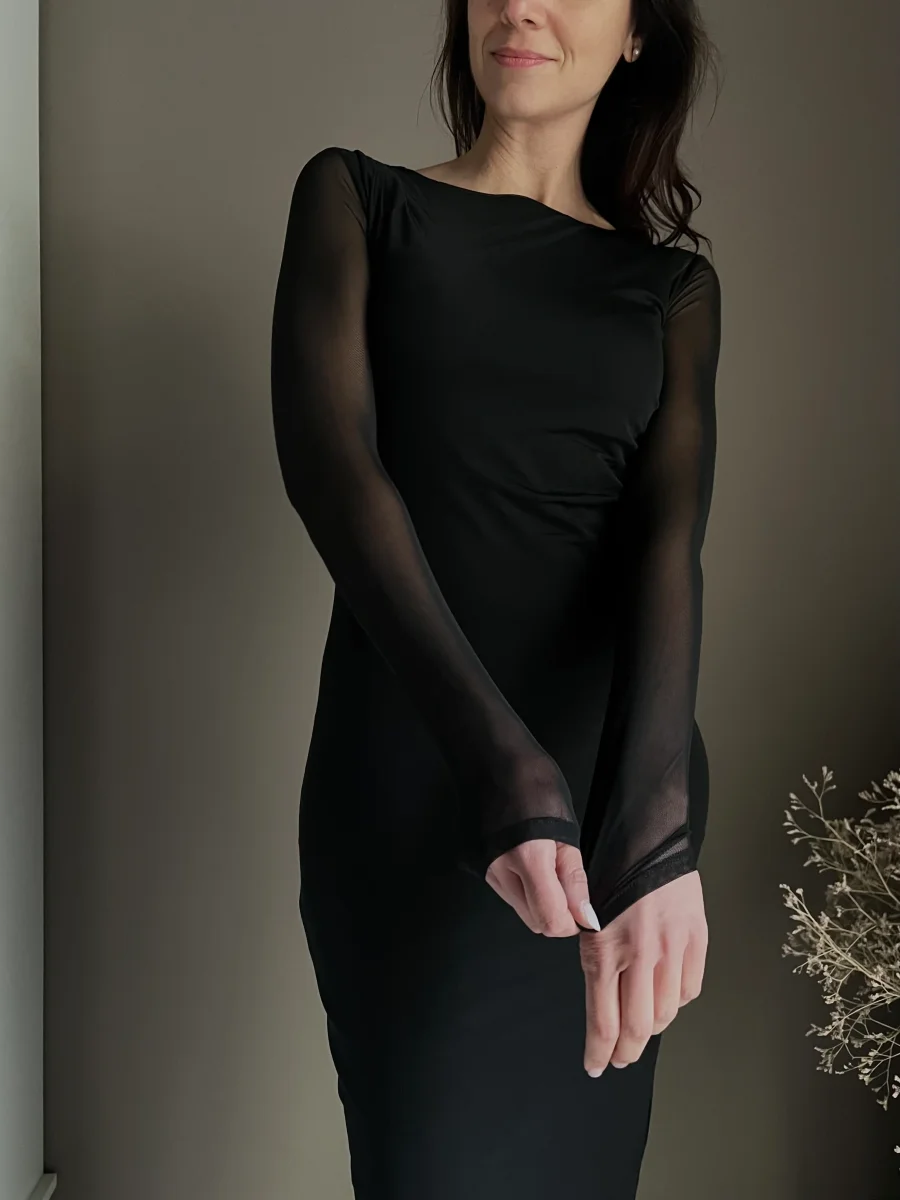 โข Gioco di Trasparenze: Mentre il corpo dellโabito รจ completamente foderato per offrire coprenza e sicurezza, le maniche lunghe restano velate, creando un sofisticato contrasto “vedo-non vedo”.
