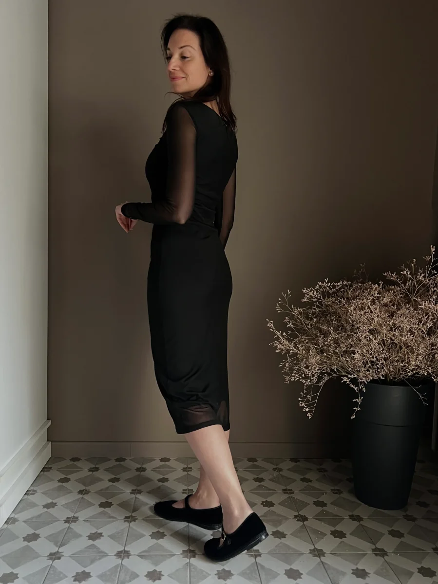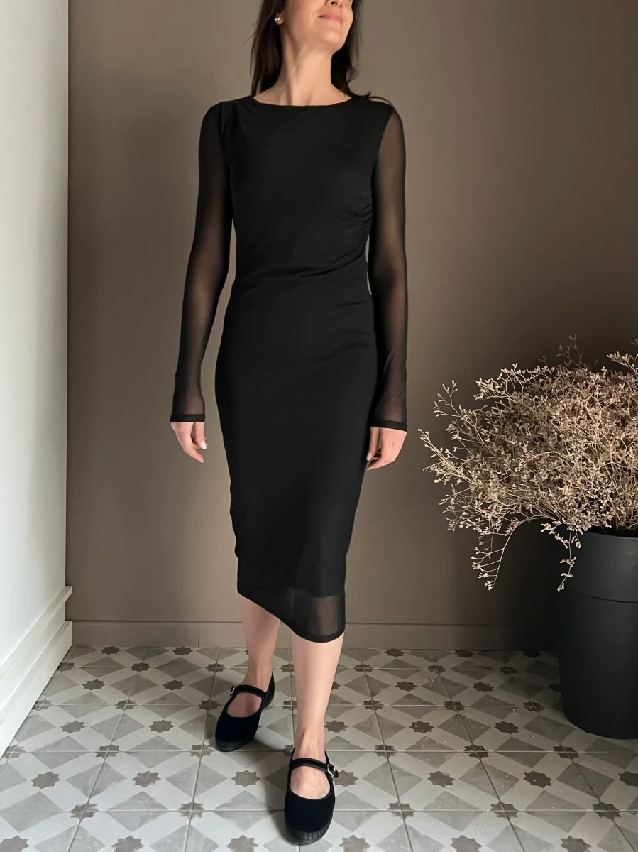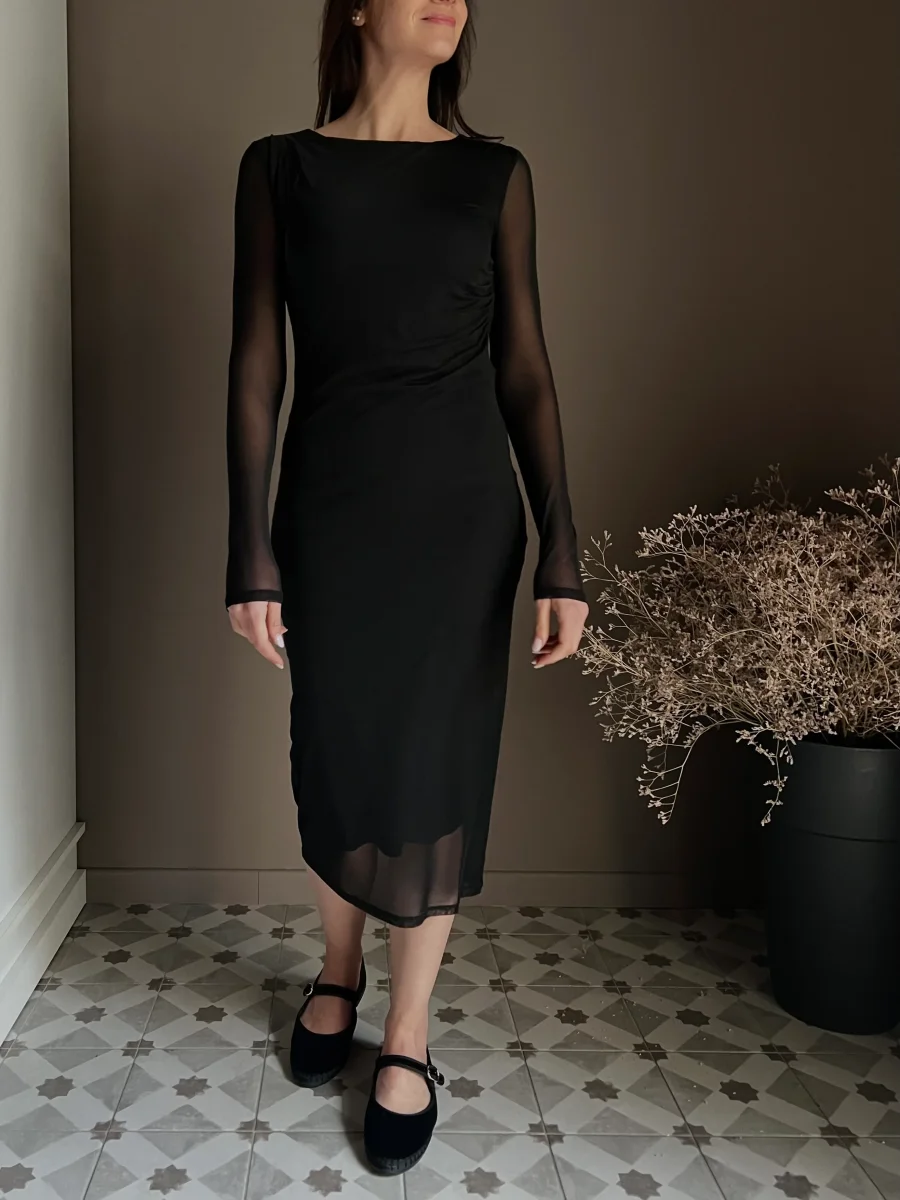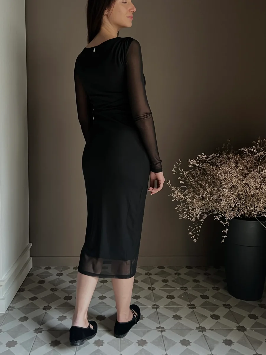 Questo abito midi firmato Patrizia Pepe รจ lโessenza della femminilitร versatile: un capo che unisce unโestetica sensuale a un comfort assoluto. Realizzato in un tulle nero morbidissimo e stretch, รจ studiato per adattarsi alle forme senza costrizioni, rendendo il piacere di indossarlo pari alla sua bellezza.