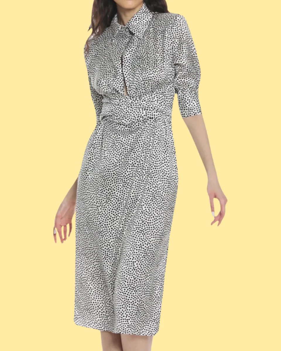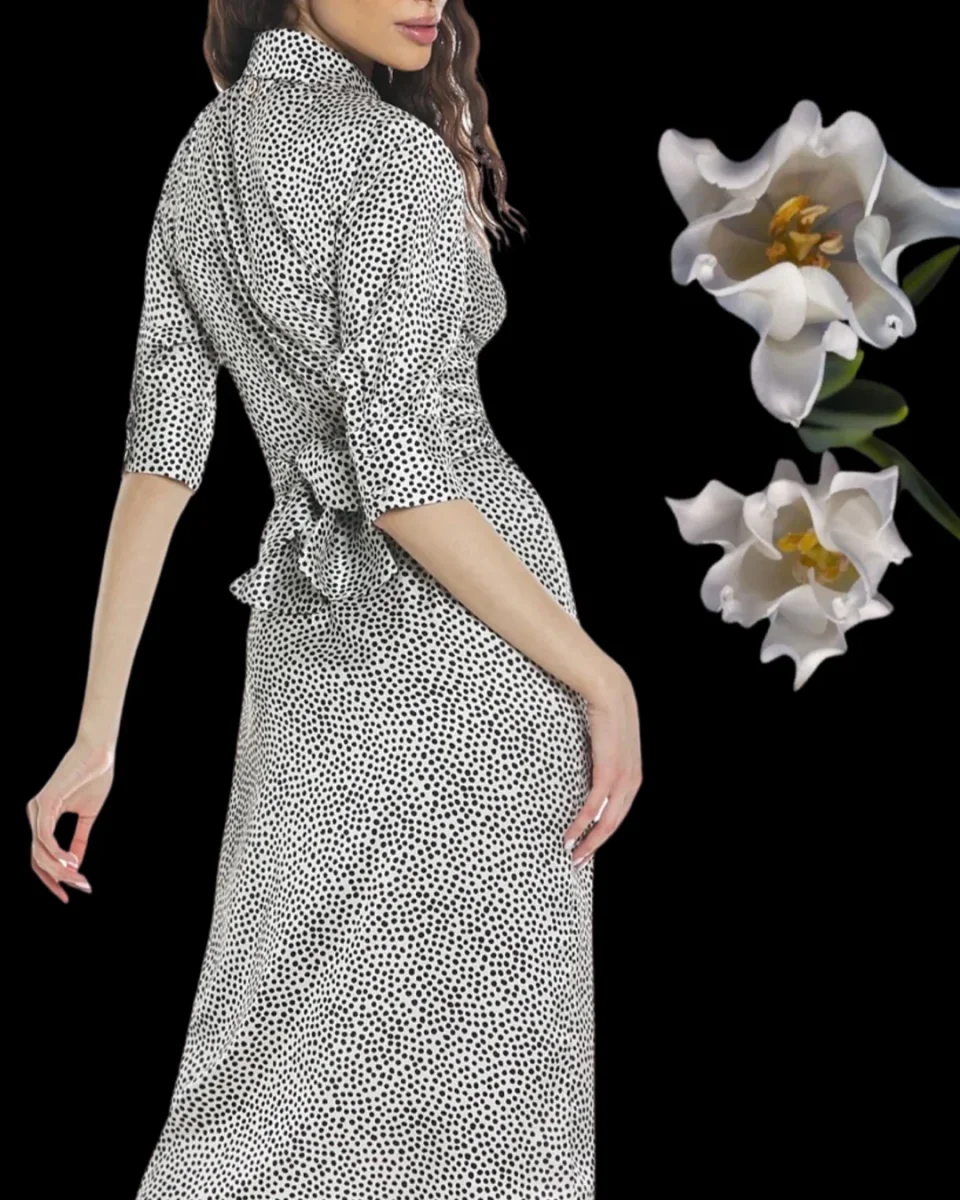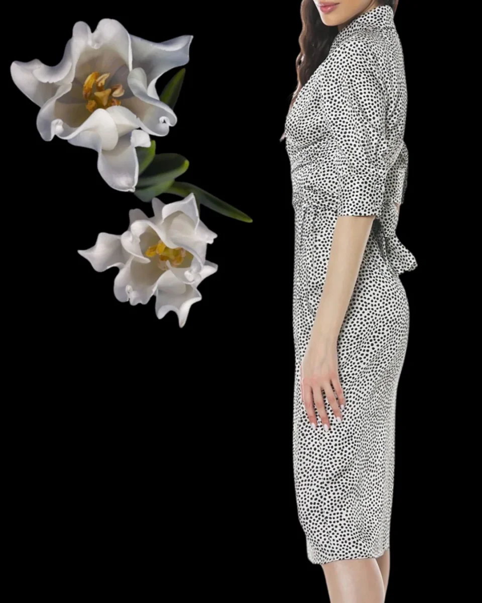 Quest’abito a piccoli pois neri su fondo crema in un tessuto fluido e raffinato รจ molto femminile e allo stesso tempo in uno stile bon ton che lo rende adatto a tutte le occasioni!