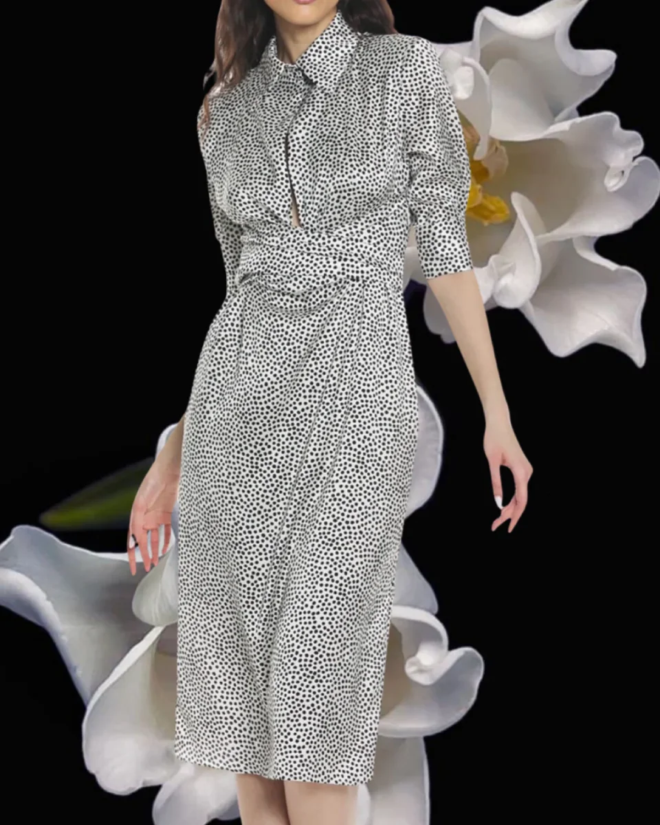 Abito “Polka Charm”. Abito raso setificato a points bianco e nero, modello corto con colletto.