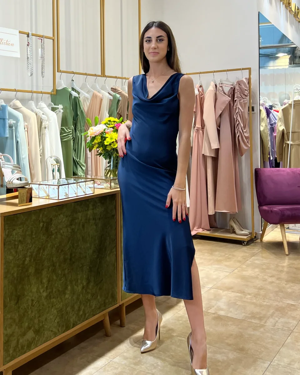Abito “Royal Sapphire”. Abito lunghette in tessuto fluido con scollo drappeggiato d’avanti e scollatura profonda sul dietro