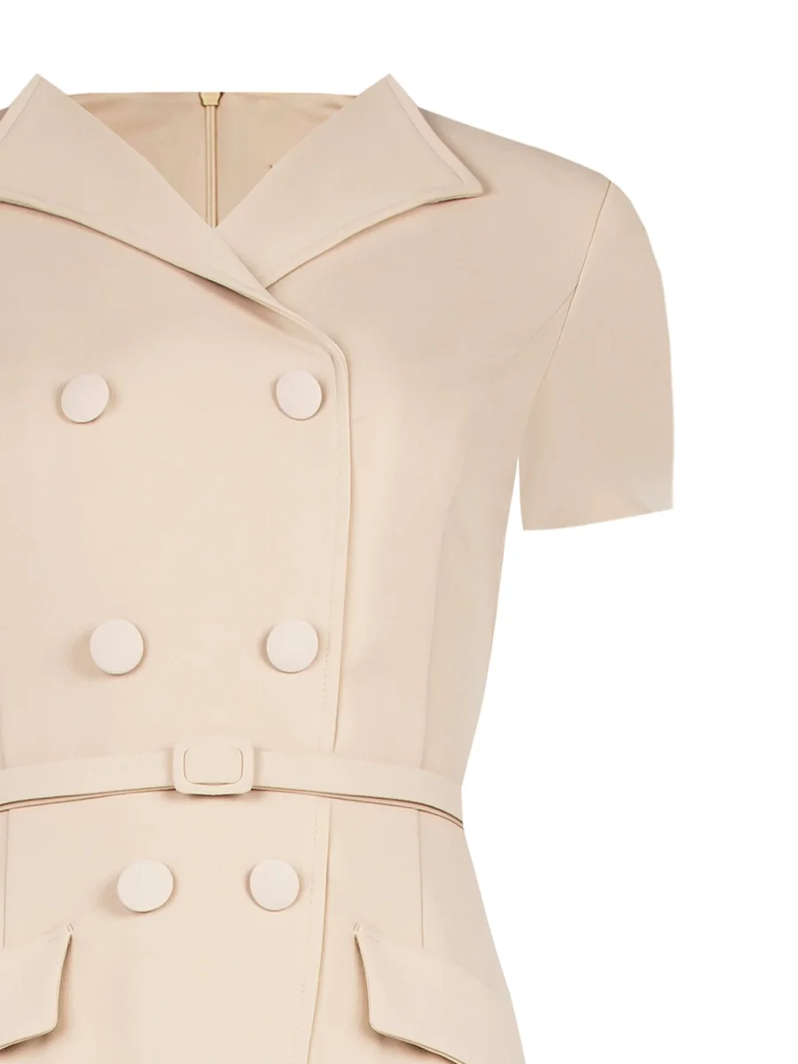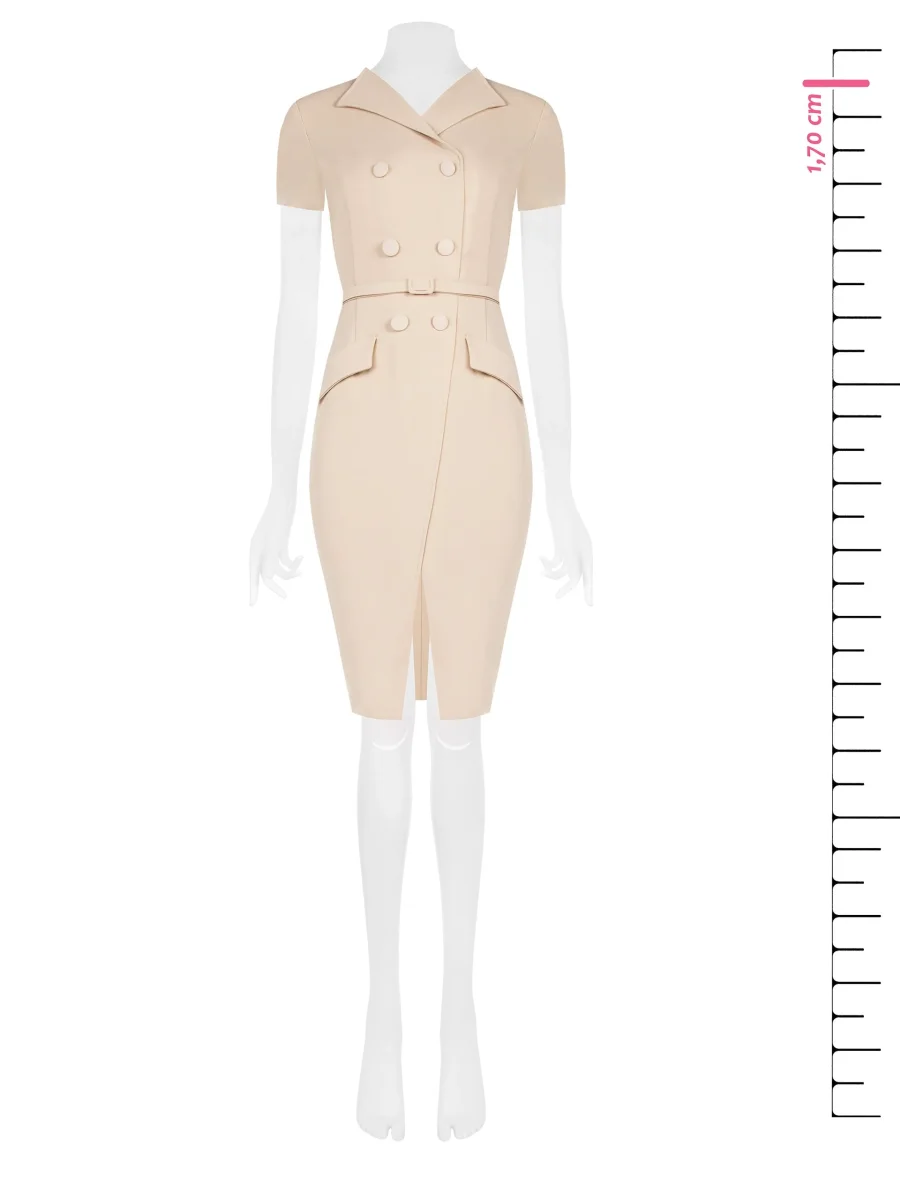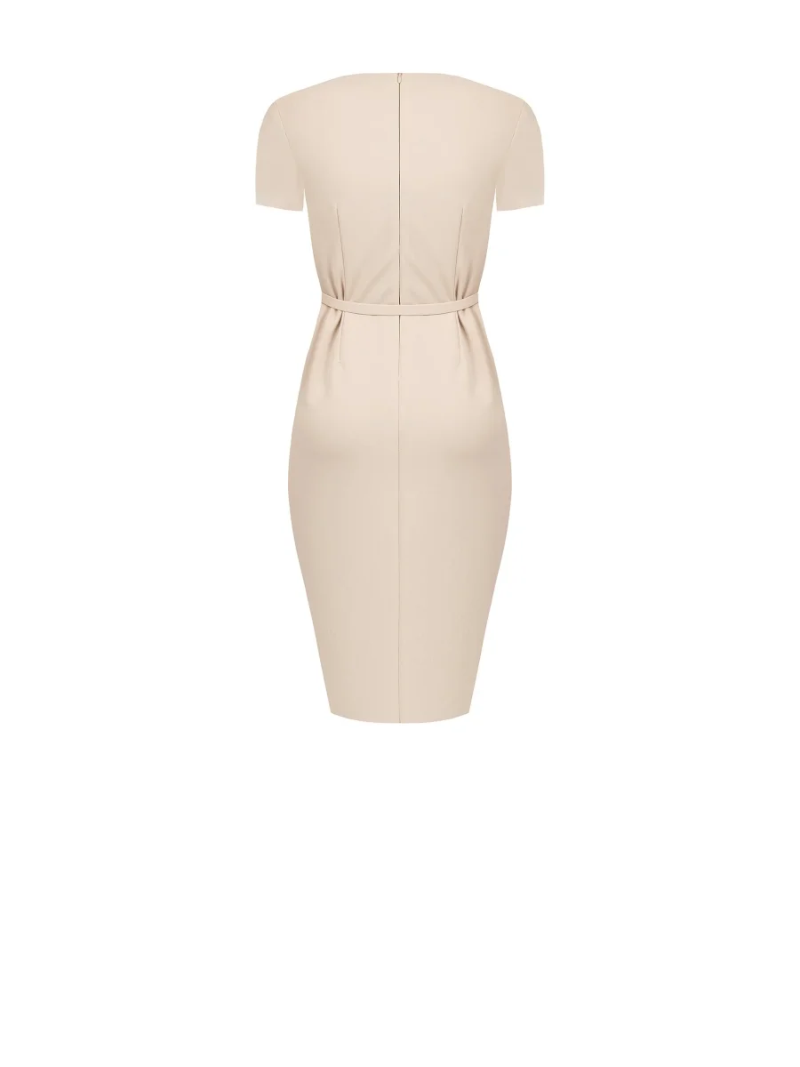 Struttura e raffinatezza. Questo abito in scuba crepe firmato Rinascimento unisce la tenuta impeccabile del tessuto tecnico all’eleganza di un design contemporaneo.