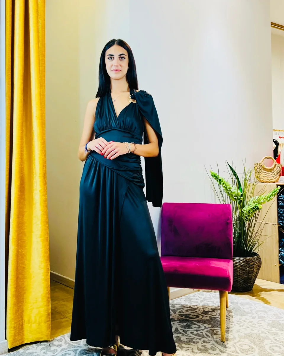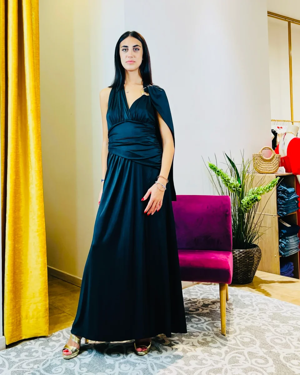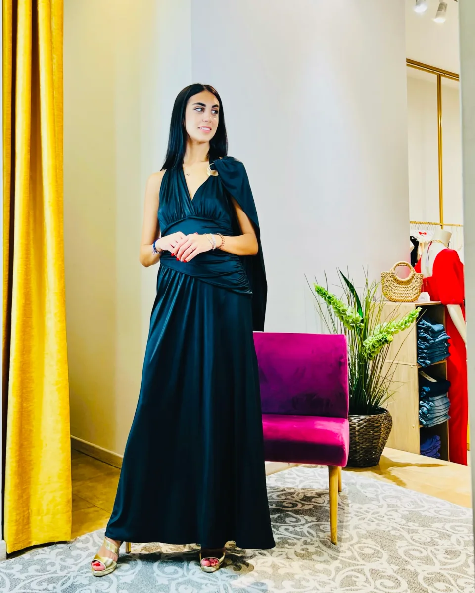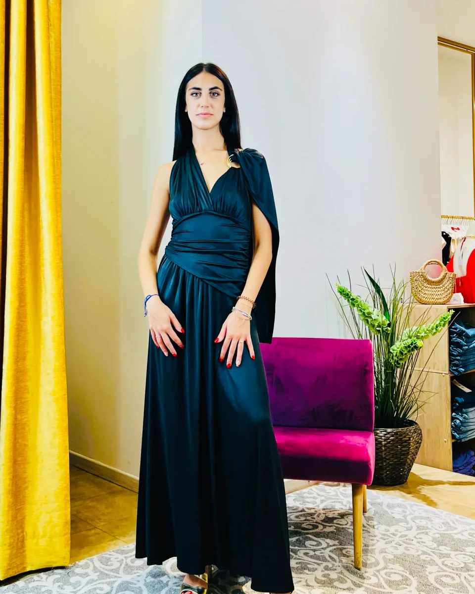 *Abito “Shadow of the Moon”. Elegante abito lungo blu notte, con drappo fluido e schiena scoperta.