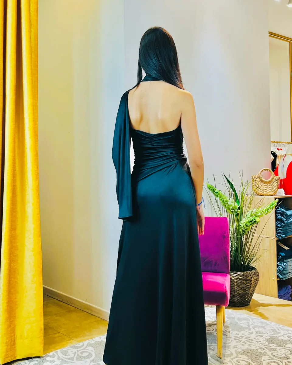 Ti senti davvero femminile e sicura con questo abito addosso, soprattutto grazie alla scollatura e al dettaglio monospalla che lo rendono particolare senza esagerare.