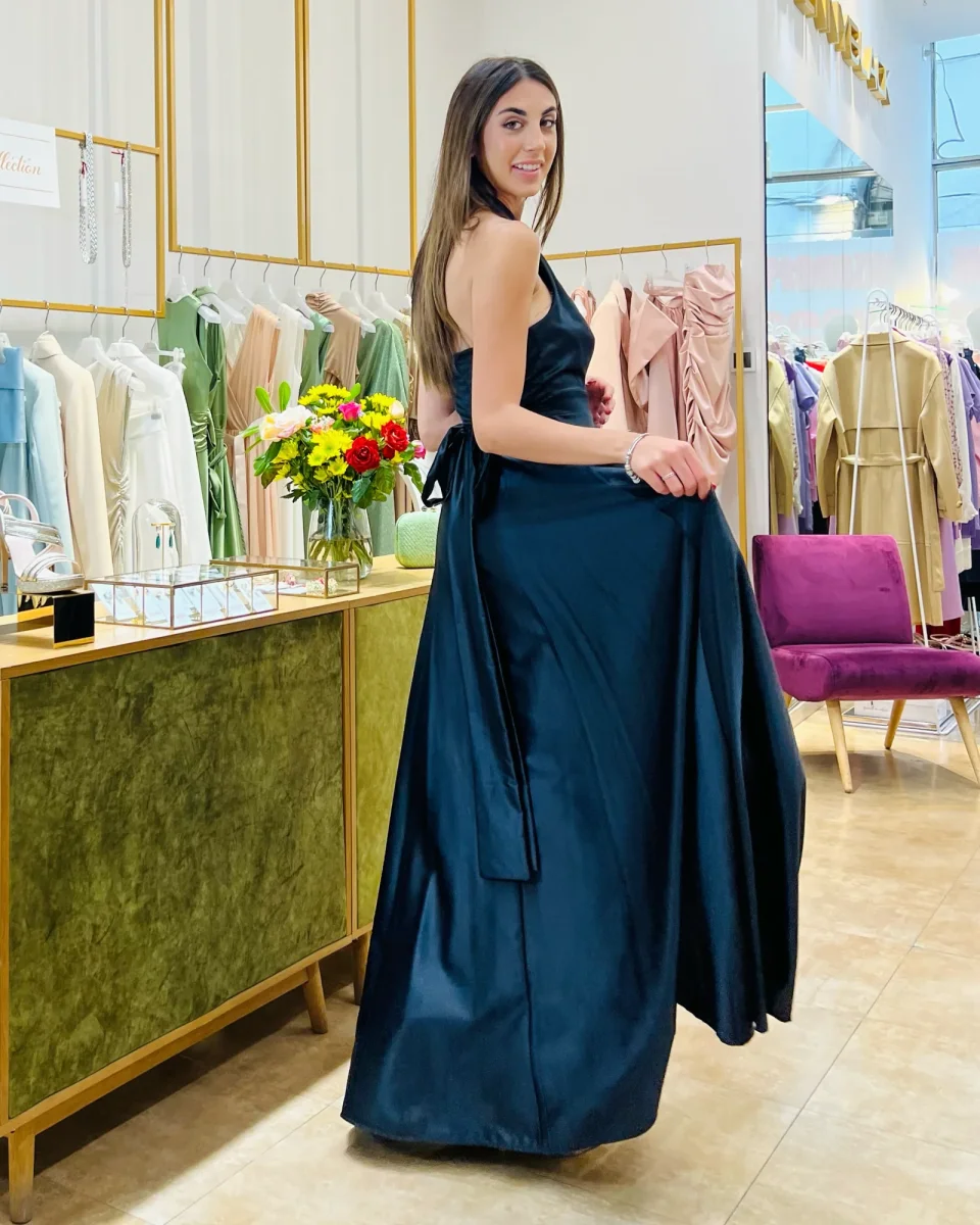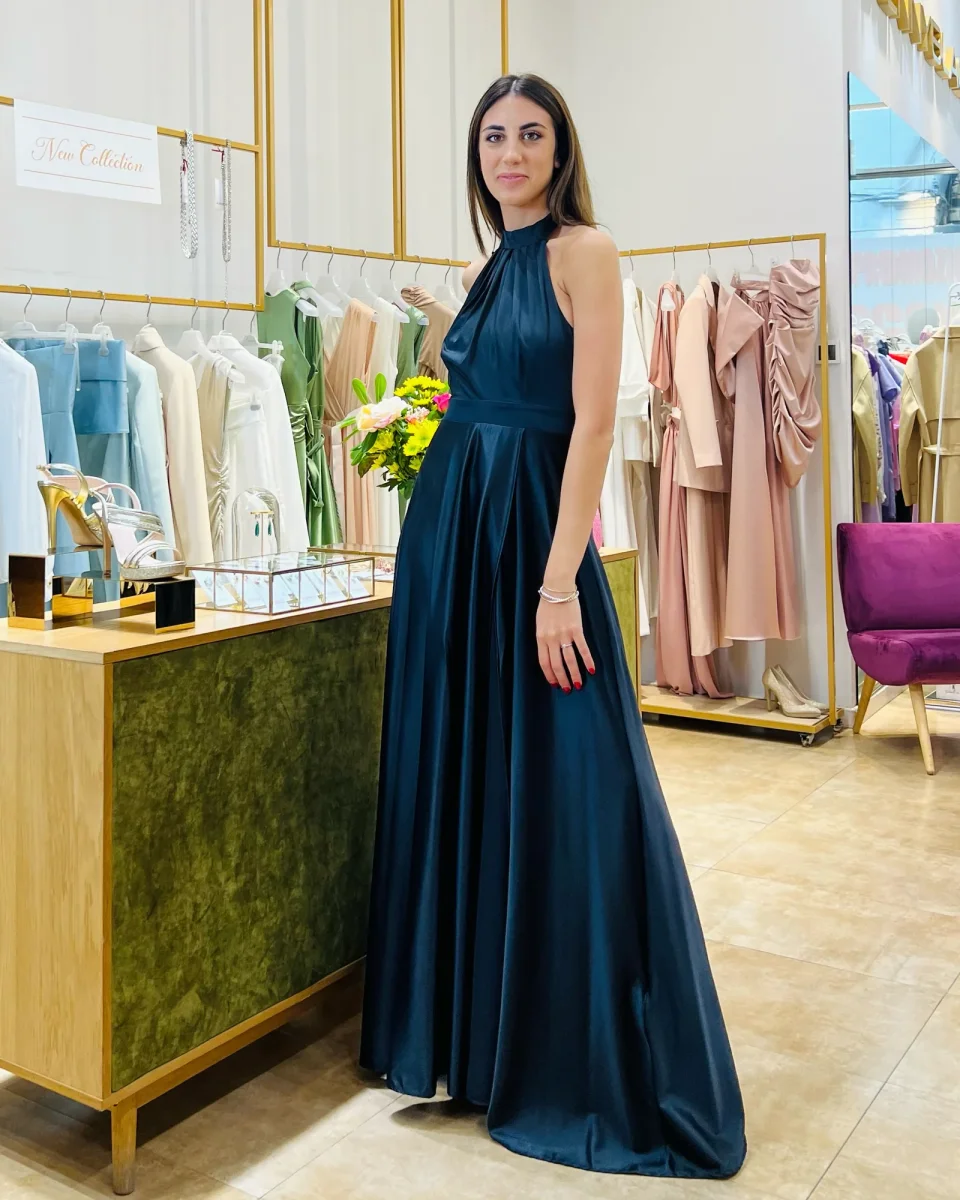 *Abito “Shadow of the Moon”. Elegante abito lungo blu notte, con drappo fluido e schiena scoperta.