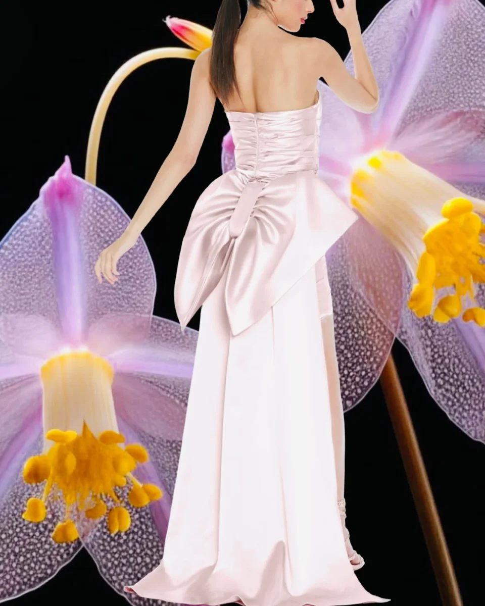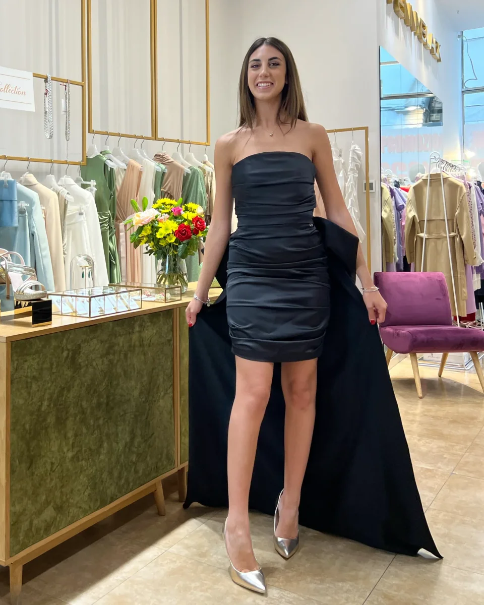 Abito “Venus Noir” D715 Questo abito รจ un elegante vestito nero in satin con design a tubino corto, senza spalline. Il dettaglio distintivo รจ una lunga coda posteriore che aggiunge un tocco drammatico e raffinato all’outfit, creando un contrasto accattivante con la lunghezza ridotta del vestito davanti. Le arricciature sul busto e sui fianchi offrono […]