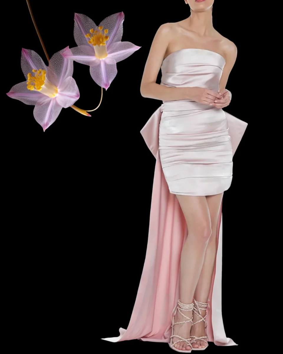 Il dettaglio distintivo รจ una lunga coda posteriore che aggiunge un tocco drammatico e raffinato all’outfit, creando un contrasto accattivante con la lunghezza ridotta del vestito davanti.