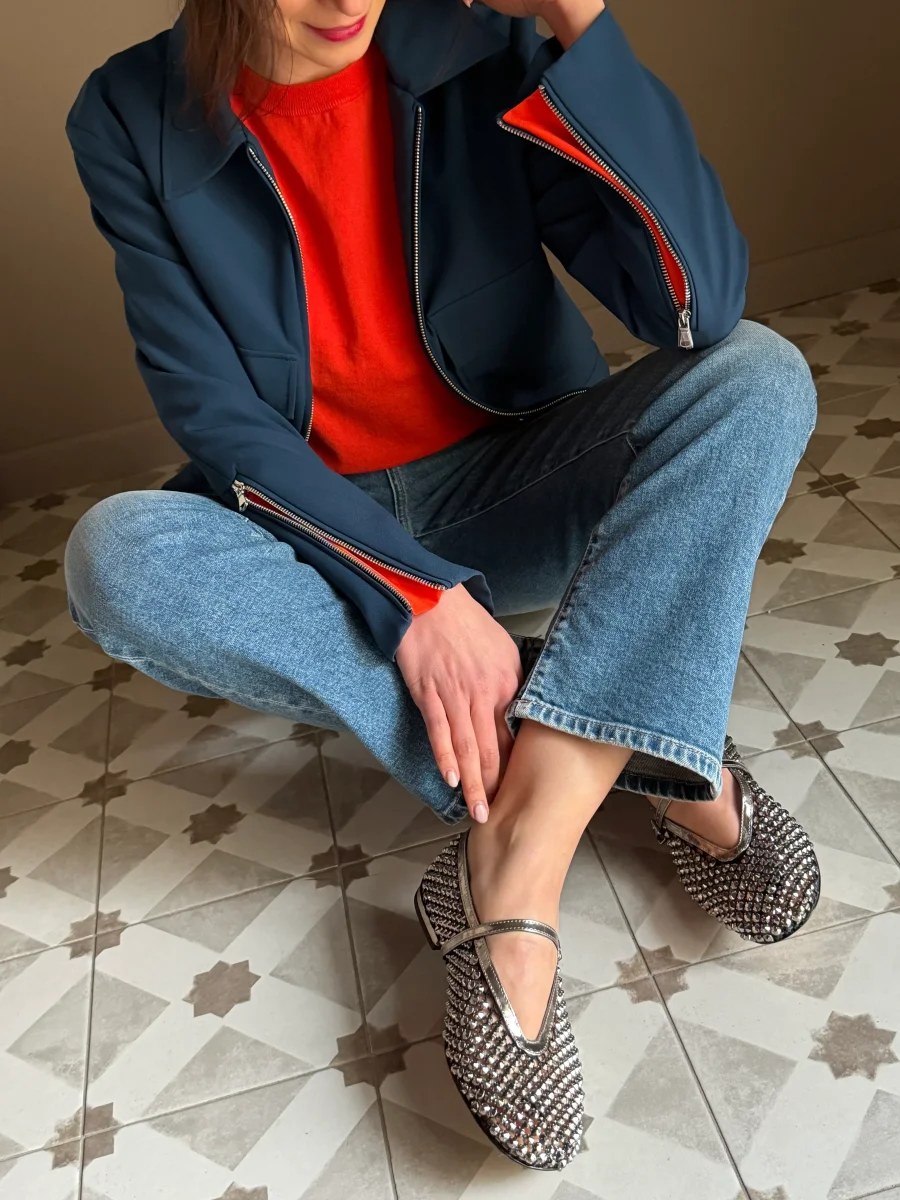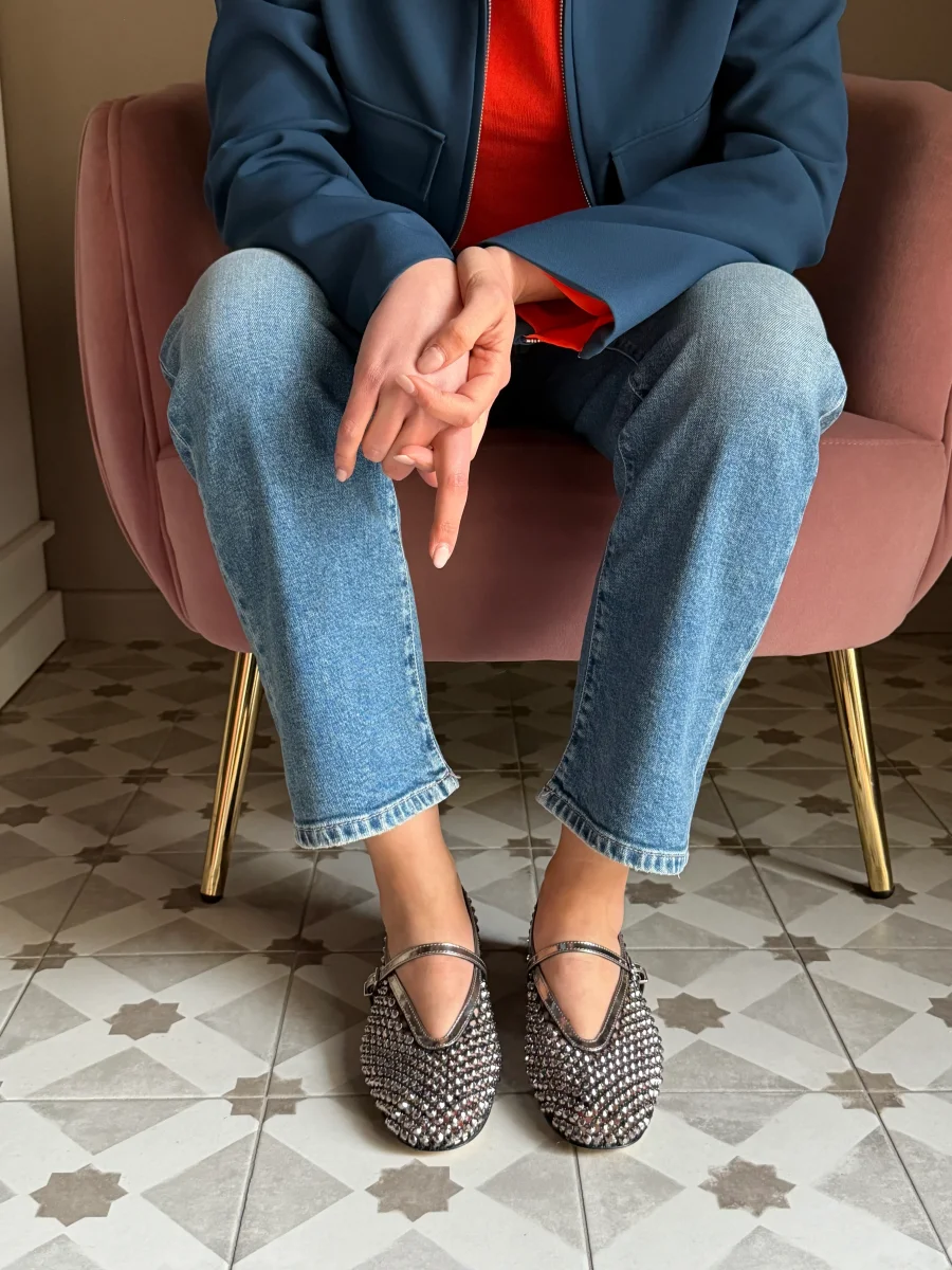 โข Urban Glam: Indossala con il denim blu medio di Icon Denim per un contrasto tra il grezzo del jeans e la luce dei cristalli, creando un look quotidiano ricercato e mai scontato.
