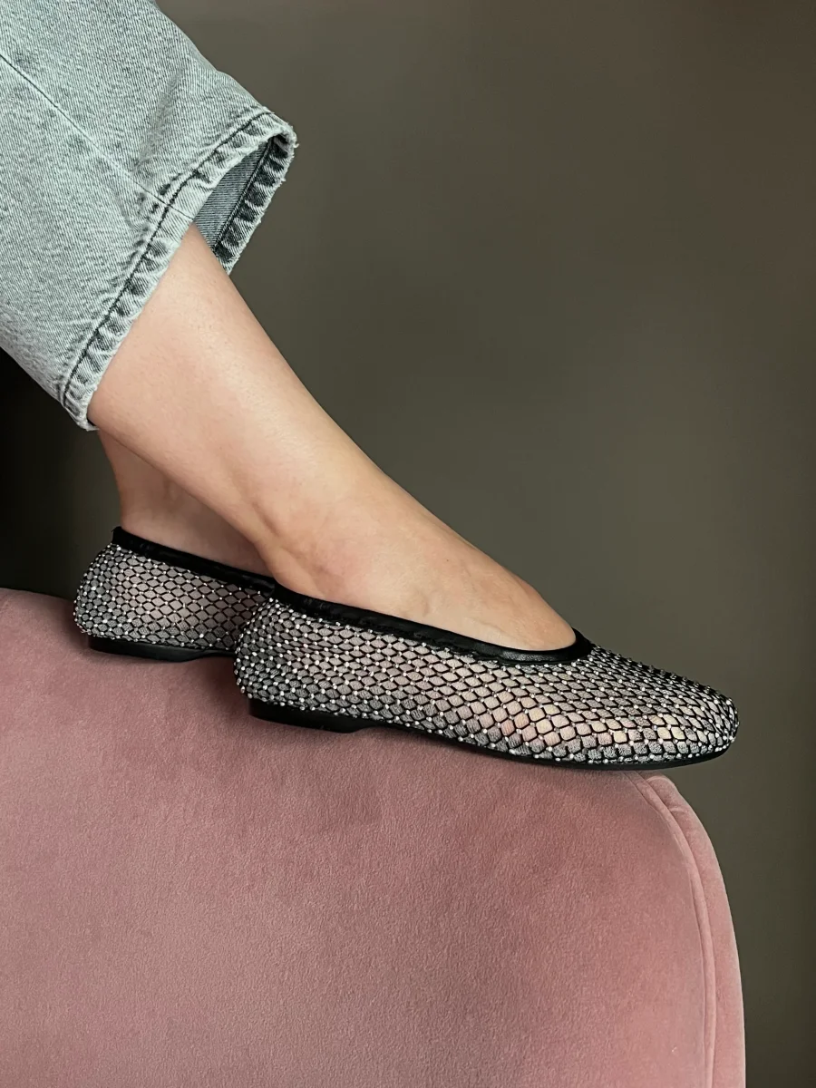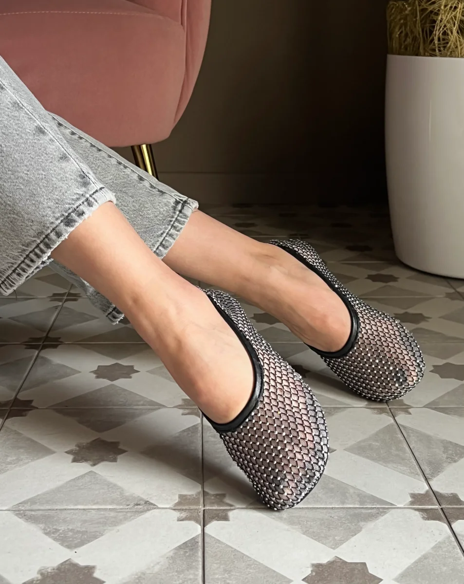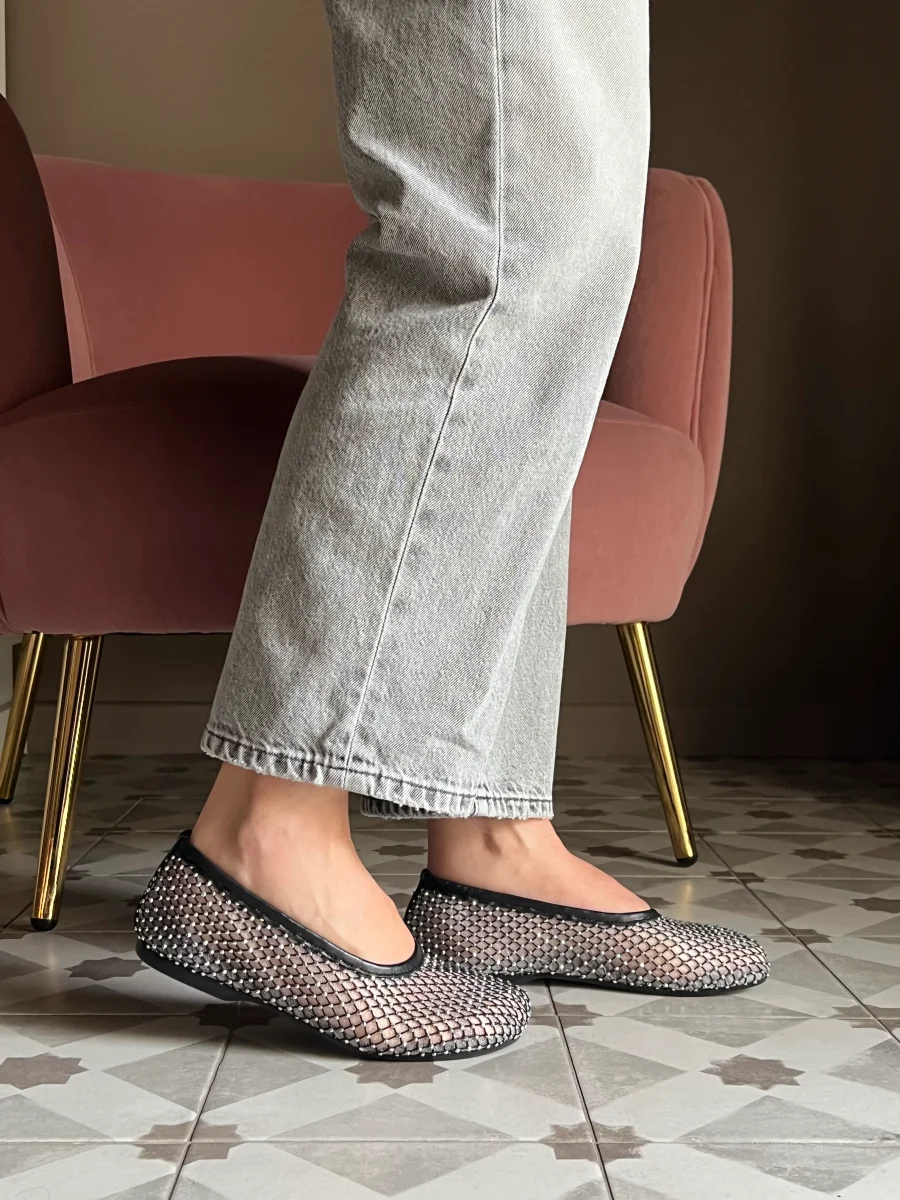 Questa ballerina in rete รจ impreziosita da piccoli strass scintillanti,che donano unโeleganza luminosa e sofisticata. La struttura leggera avvolge il piede con delicatezza, mentre il fondo in gomma assicura comfort e flessibilitร . Perfetta per completare look raffinati con un dettaglio prezioso.