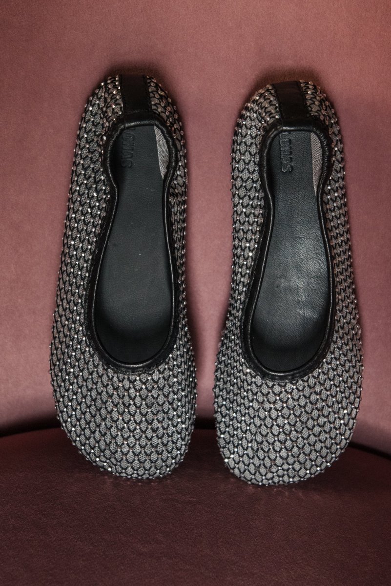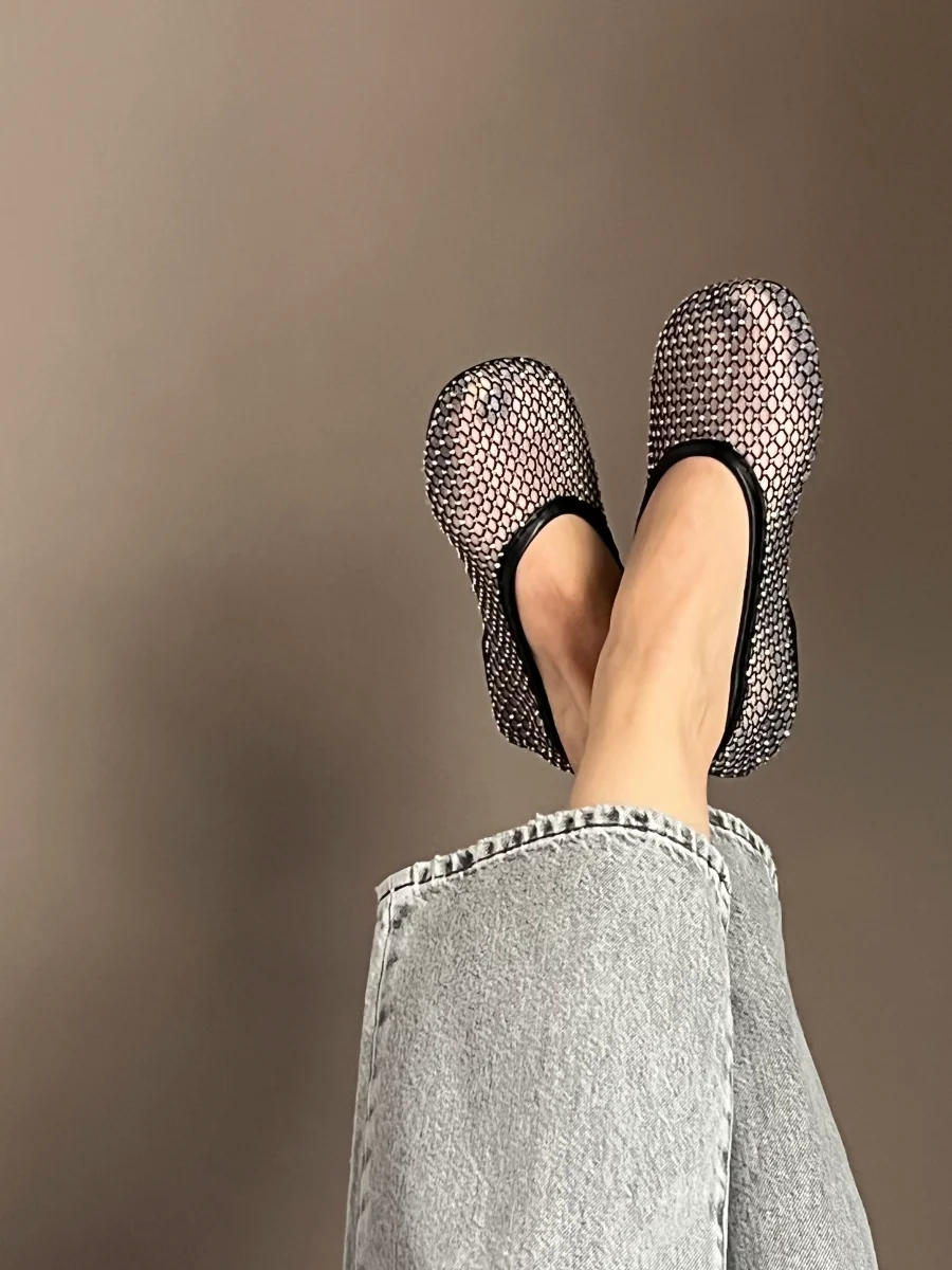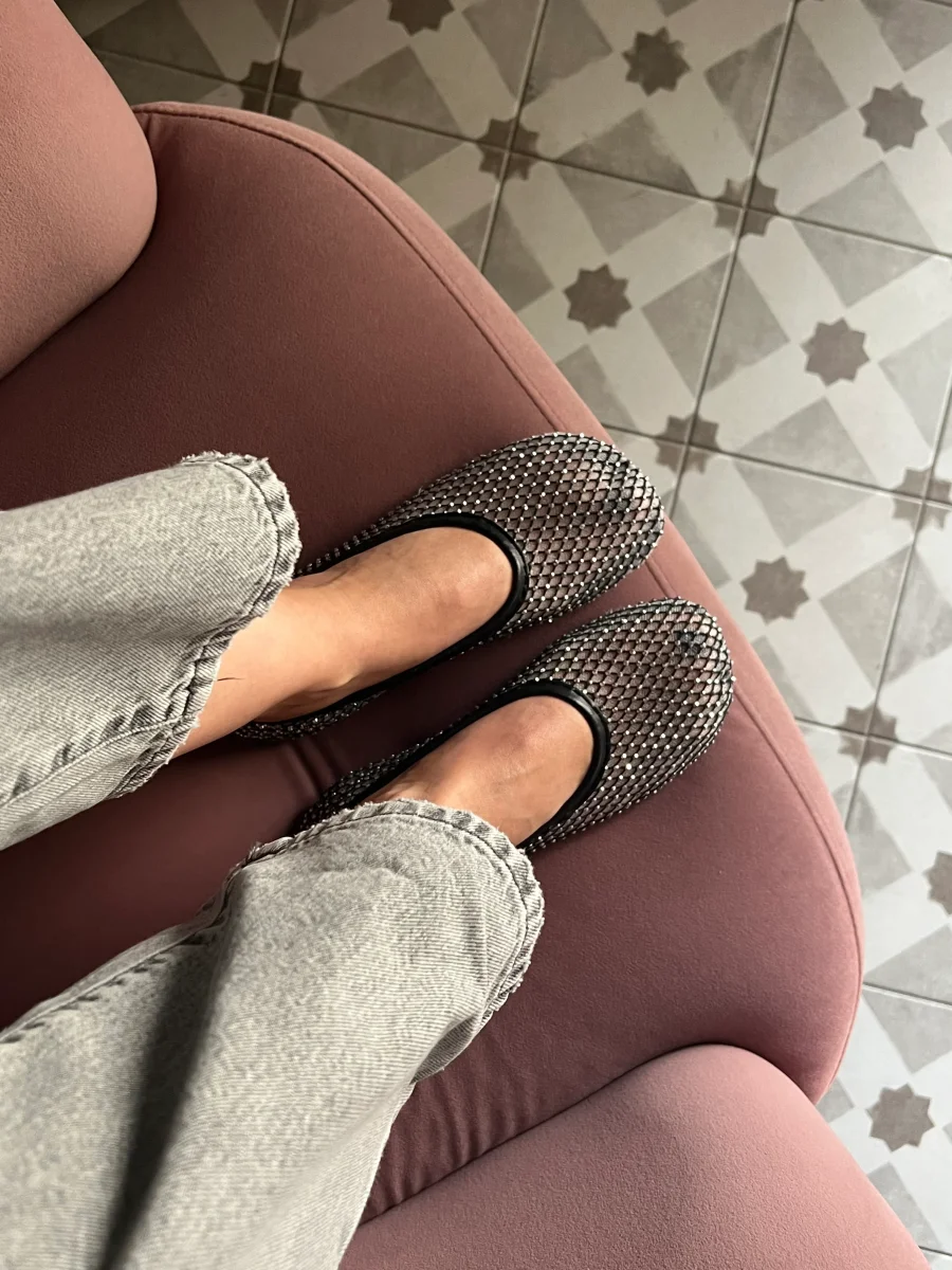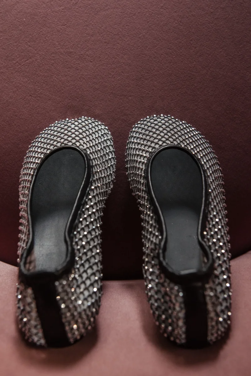 Questa ballerina in rete รจ impreziosita da piccoli strass scintillanti,che donano unโeleganza luminosa e sofisticata. La struttura leggera avvolge il piede con delicatezza, mentre il fondo in gomma assicura comfort e flessibilitร . Perfetta per completare look raffinati con un dettaglio prezioso.