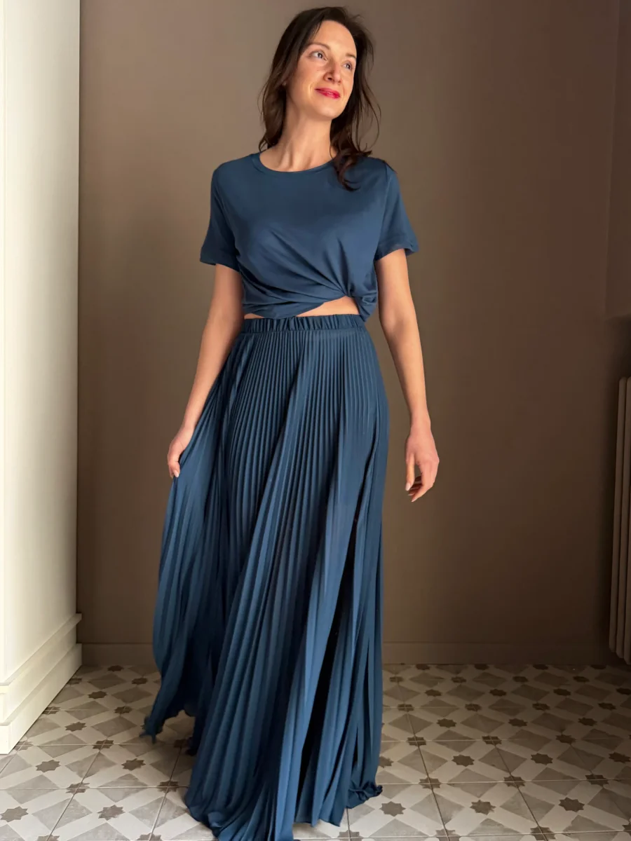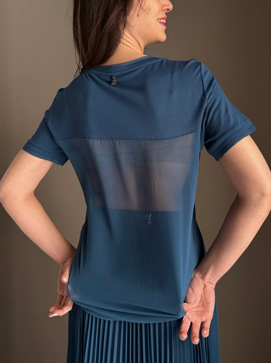 Eleva il concetto di “t-shirt ” con questo capo in 100% viscosa dalla lucentezza naturale. Se sul davanti si presenta come un classico intramontabile con girocollo a doppio bordino, il retro rivela unโanima sofisticata: un gioco di trasparenze audace ma raffinato che scivola in una linea stondata super femminile. Il dettaglio finale? Lโiconico rivetto Fly posteriore, sigillo di stile e qualitร .