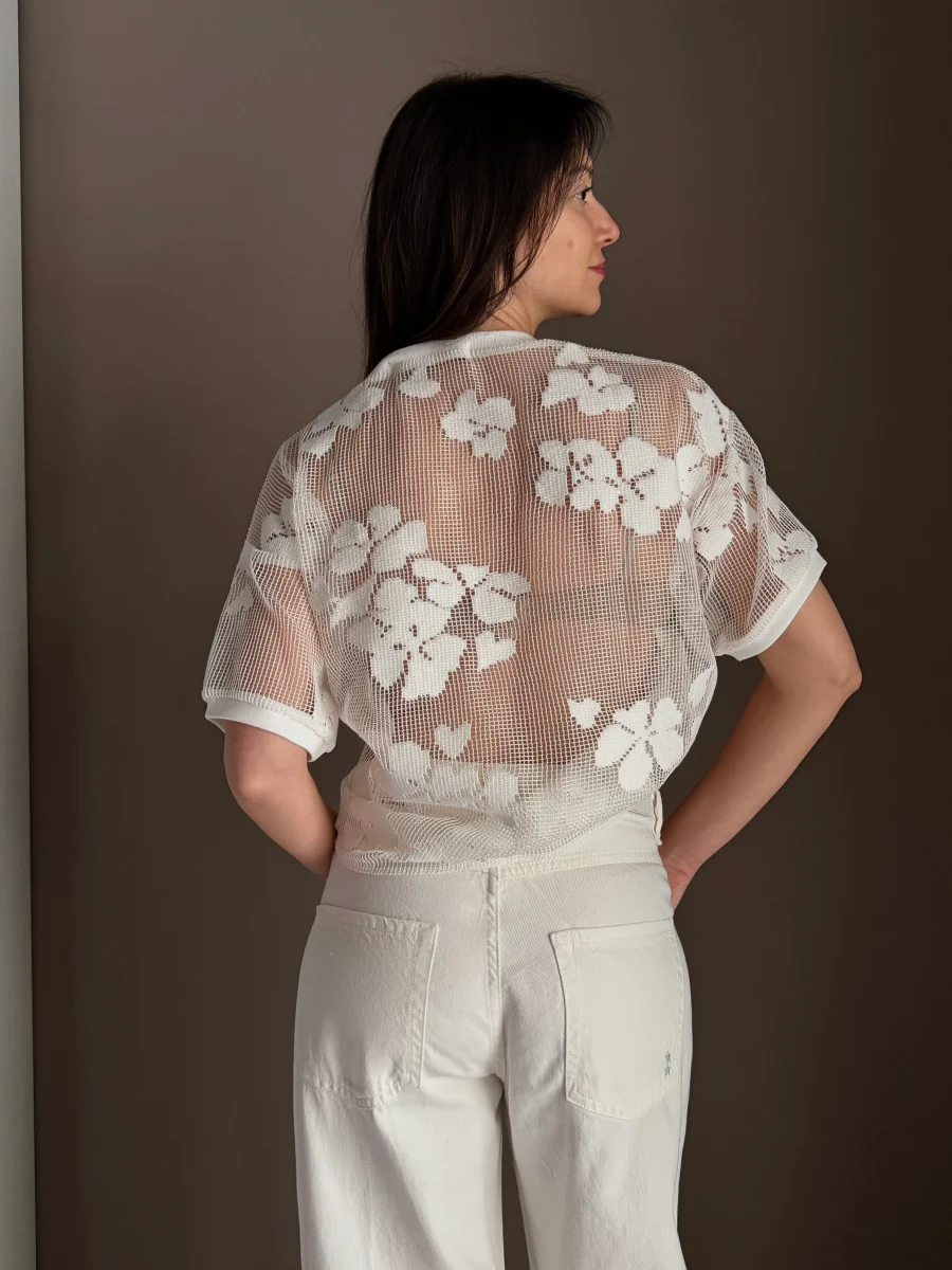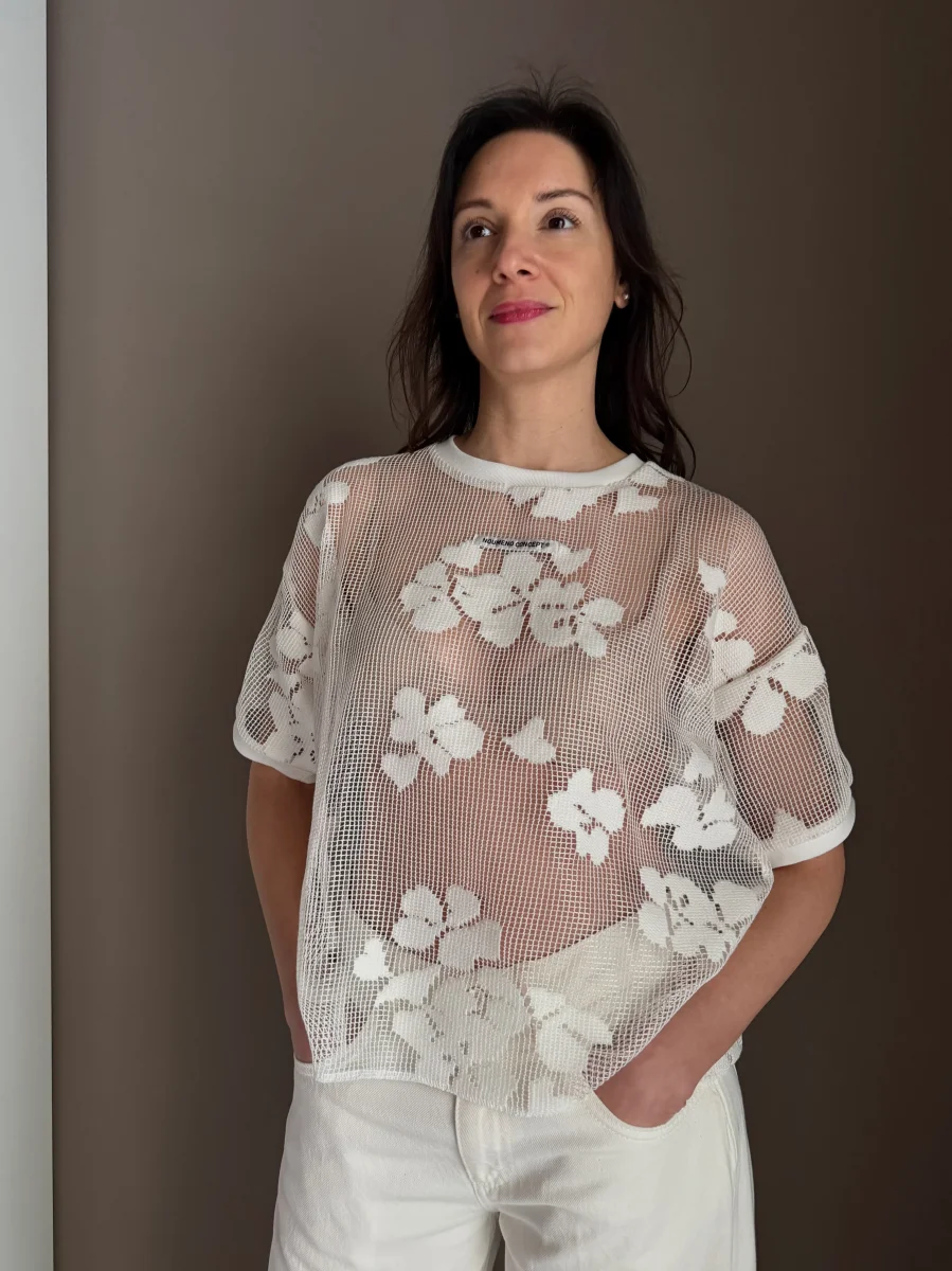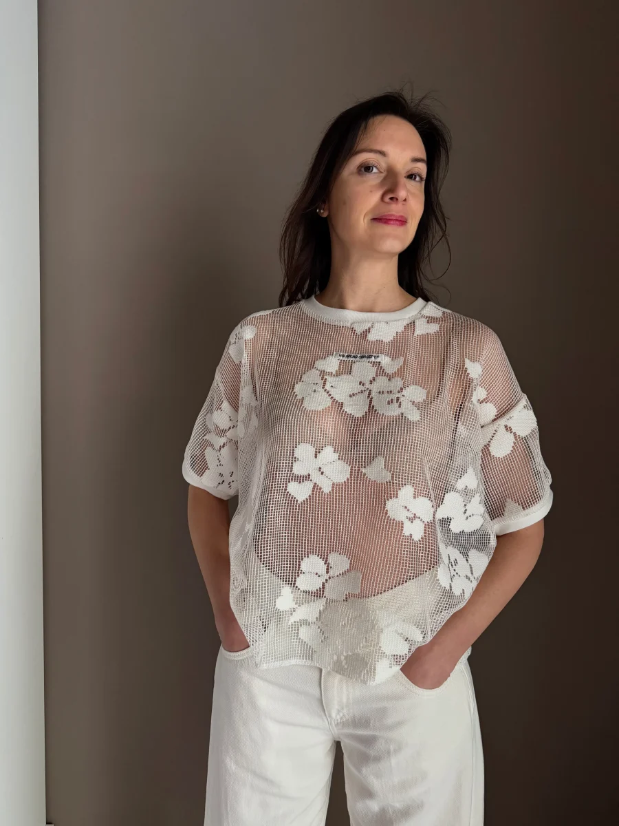 Nonostante la forma boxy sia ampia per definizione, ti suggeriamo di acquistare la tua taglia abituale. La vestibilitร รจ pensata per essere leggermente distaccata dal corpo, valorizzando la struttura geometrica del pizzo.