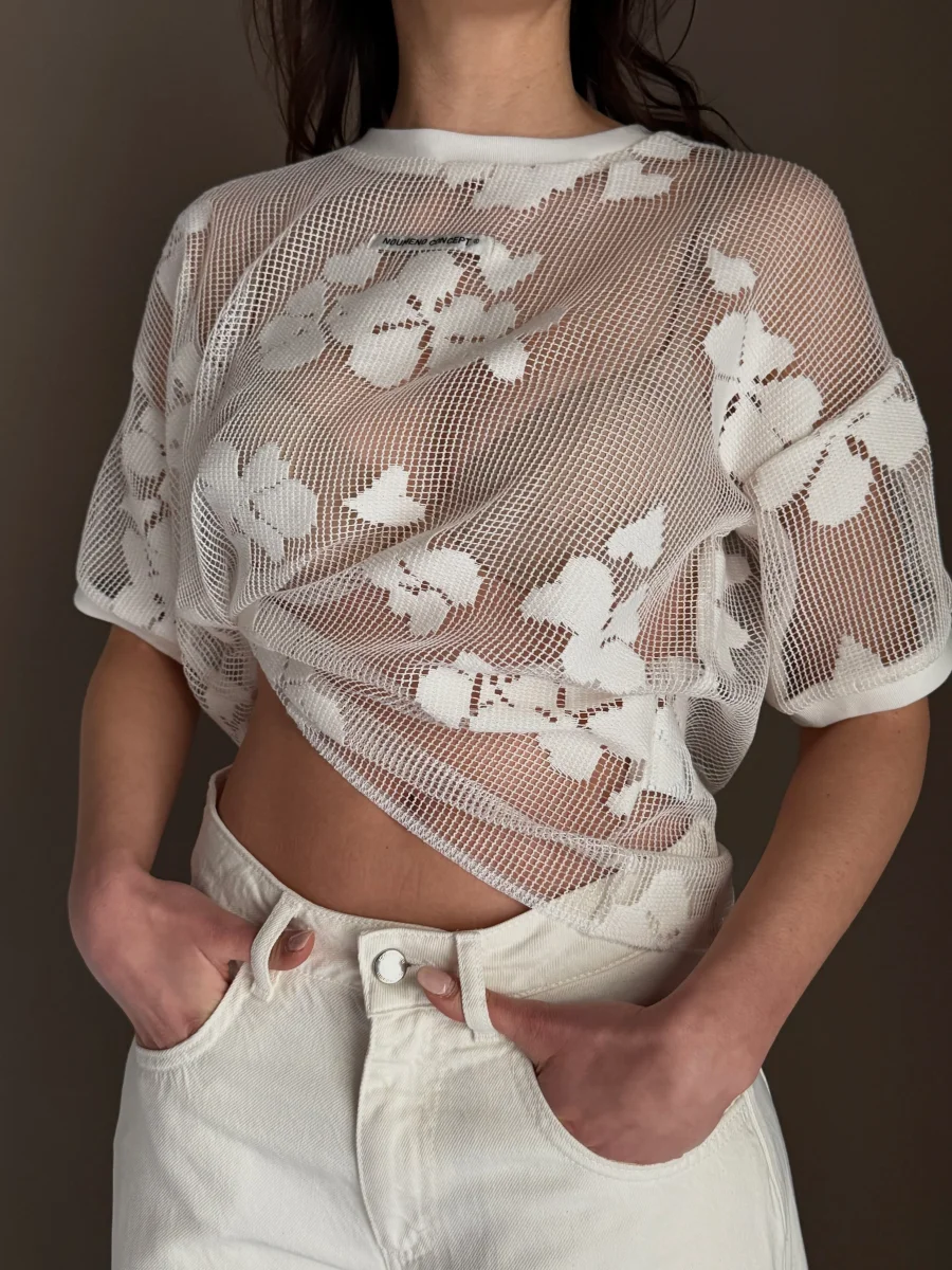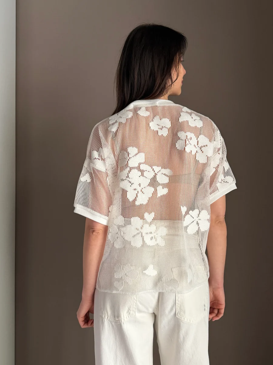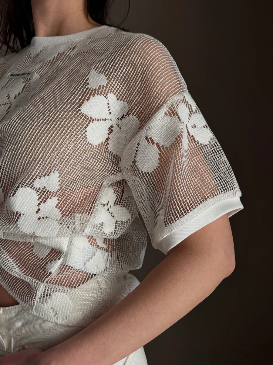 Nonostante la forma boxy sia ampia per definizione, ti suggeriamo di acquistare la tua taglia abituale. La vestibilitร รจ pensata per essere leggermente distaccata dal corpo, valorizzando la struttura geometrica del pizzo.