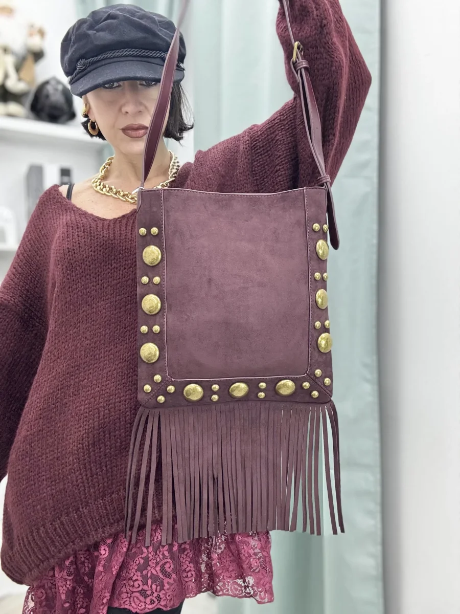 Il design รจ valorizzato da borchie decorative in diverse misure color ottone, applicate esternamente lungo i profili, che donano carattere e personalitร alla borsa. Il fondo รจ impreziosito da frange decorative, dettaglio di tendenza che richiama uno stile boho moderno.