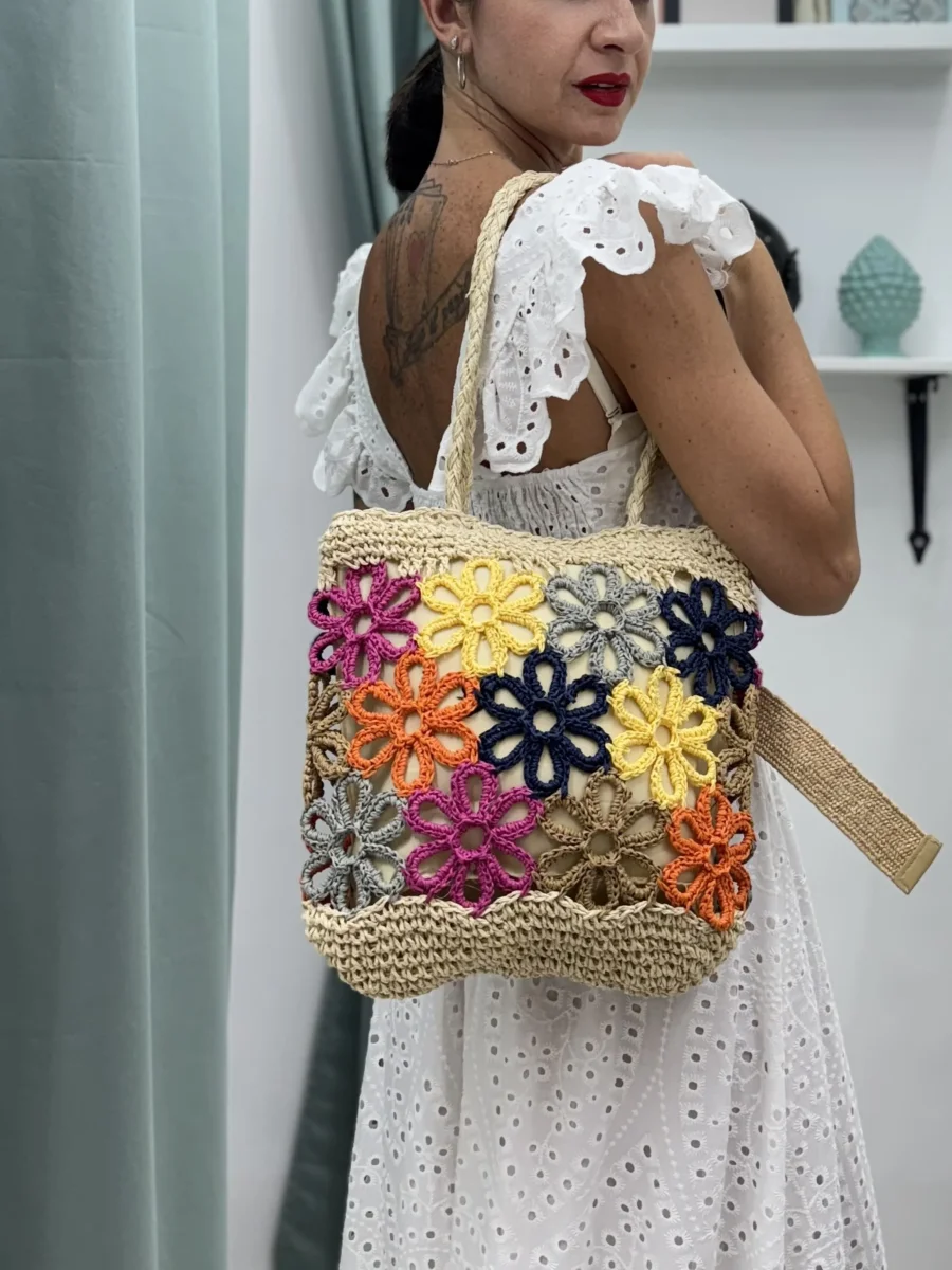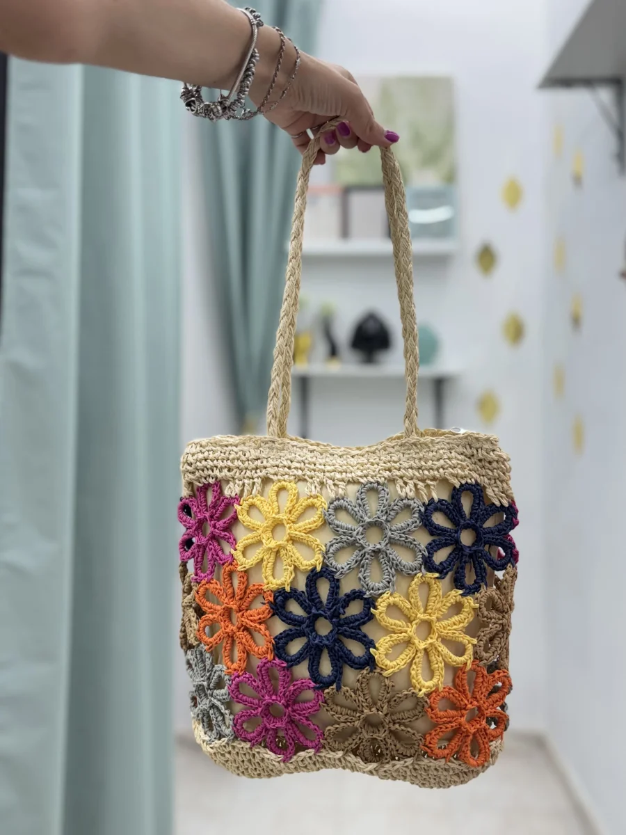 Perfetta da abbinare ad abiti leggeri, look casual o outfit da spiaggia, questa borsa artigianale unisce praticità e stile con un tocco floreale unico.