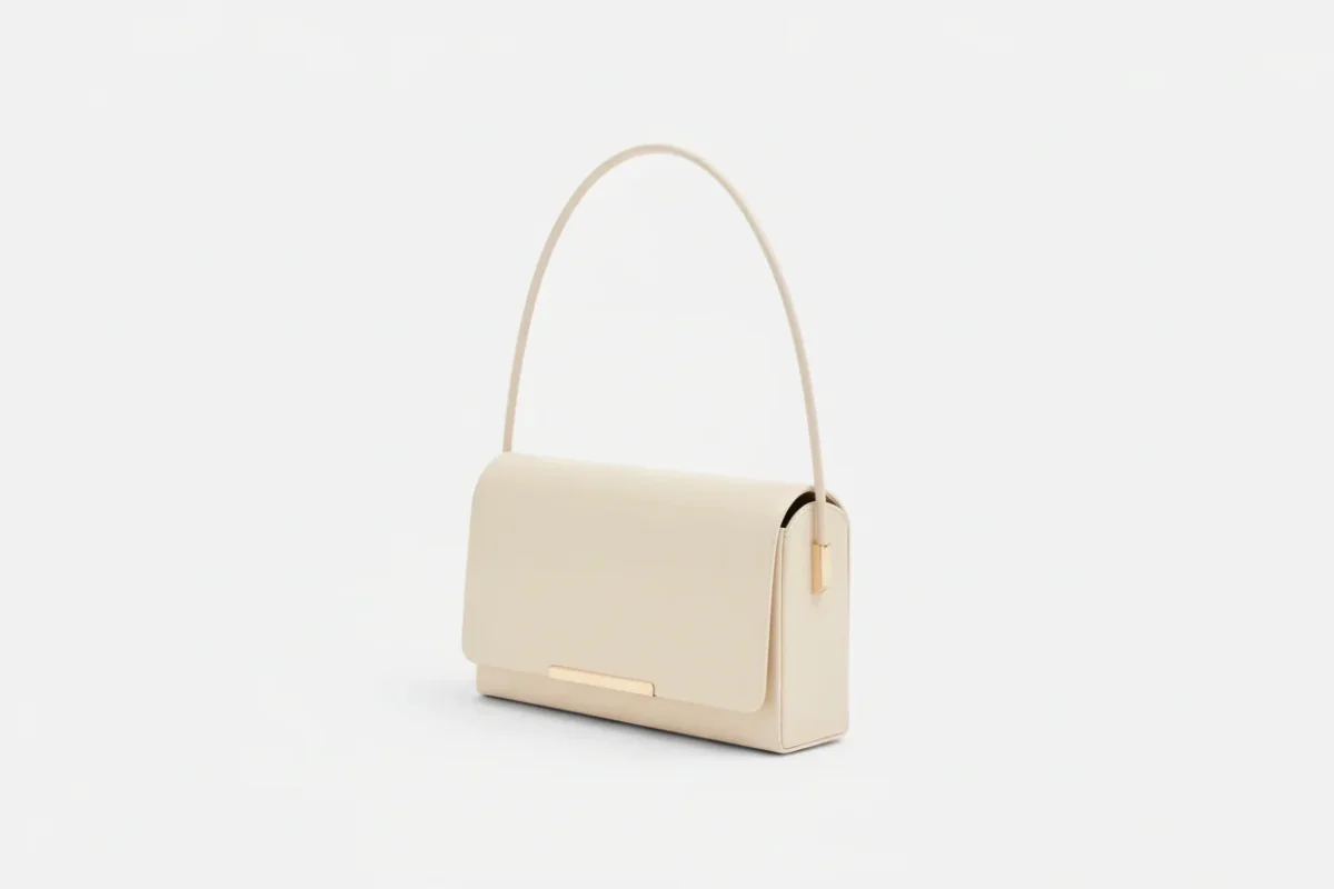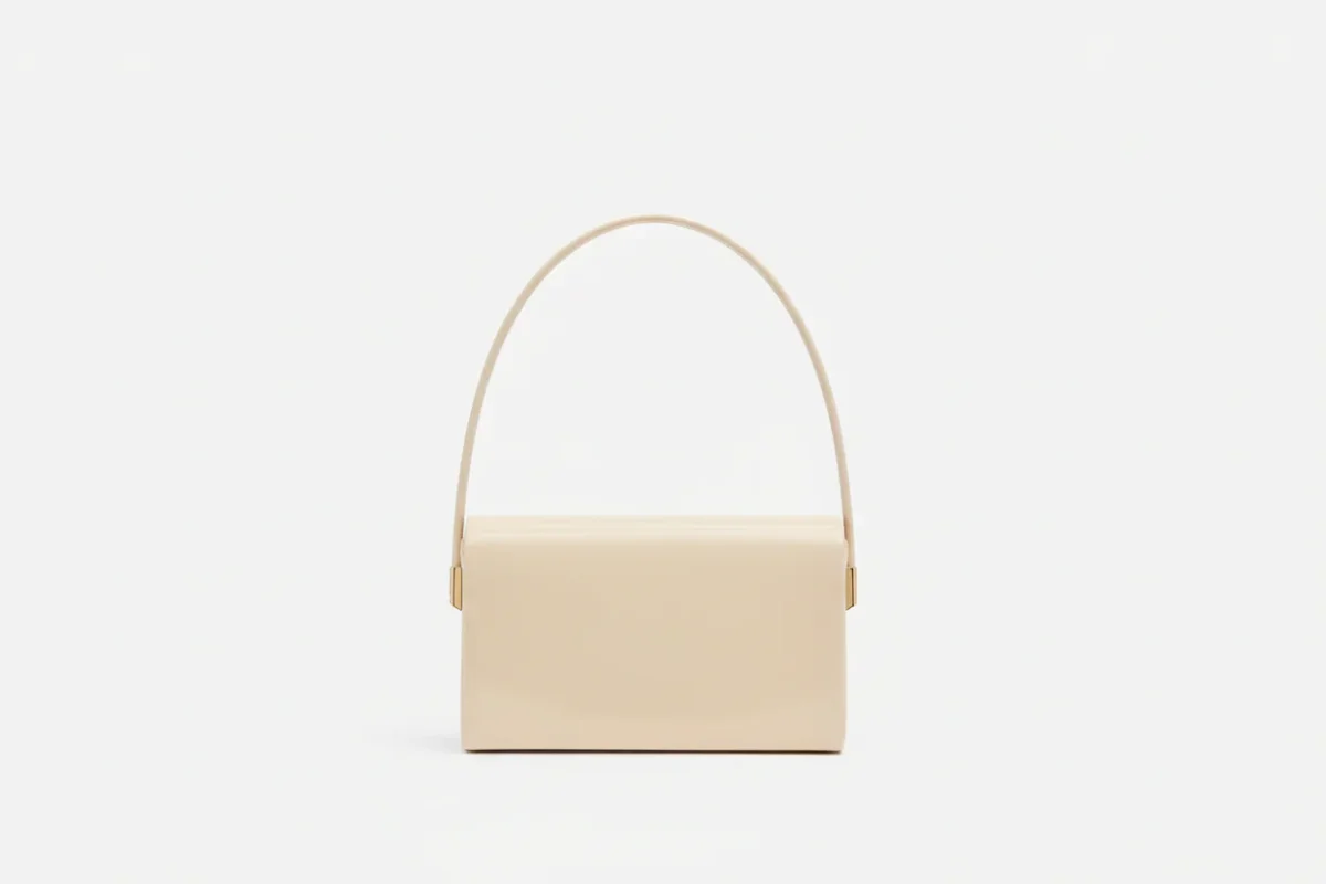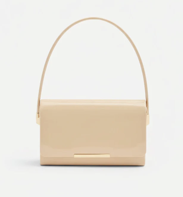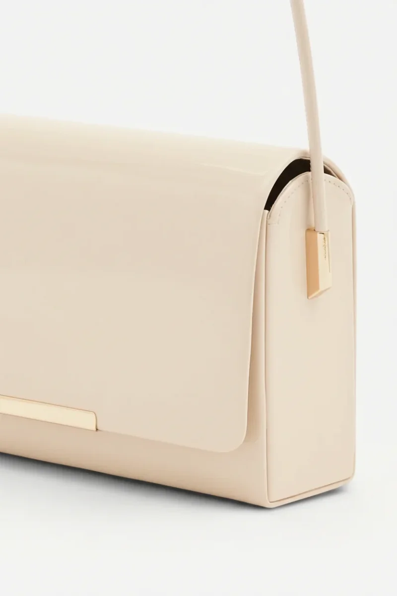 La sua silhouette rettangolare e strutturata รจ esaltata dalla finitura lucida effetto vernice, in una delicata tonalitร beige che ne sottolinea la raffinatezza. Il design, pulito ed essenziale, รจ impreziosito dal manico superiore sottile e arcuato e da discreti inserti metallici con finitura dorata. L’elemento distintivo รจ l’inserto in metallo lucido dorato che decora la parte frontale, un dettaglio che cattura la luce e aggiunge un tocco di ricercatezza. La chiusura con bottone automatico รจ funzionale e discreta, perfettamente integrata nel design.