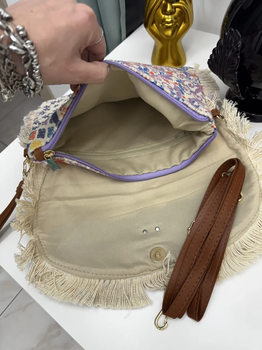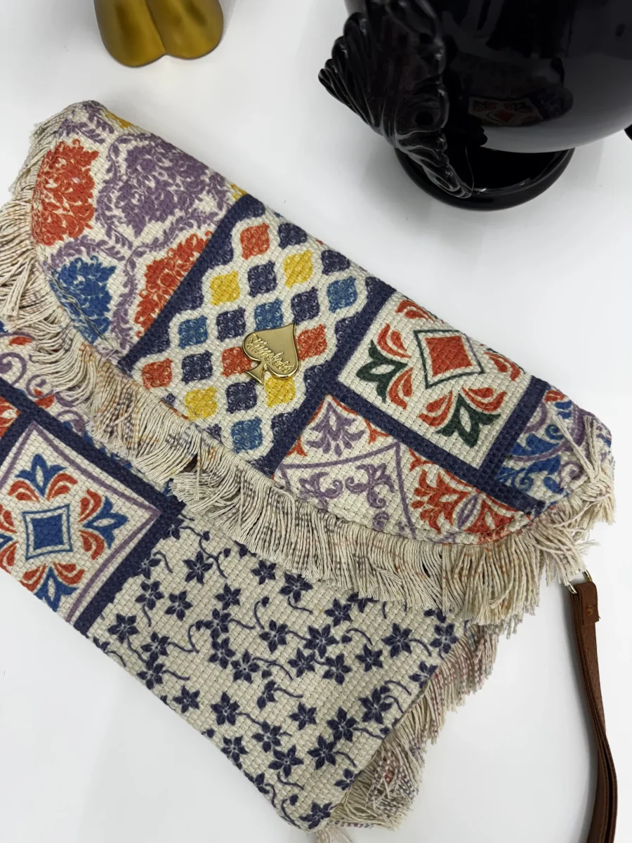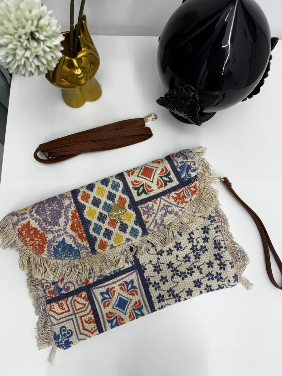 Borsa pochette in stoffa con fantasie multicolor con manico e tracolla regolabile e rimovibile chiusura con zip e interno foderato