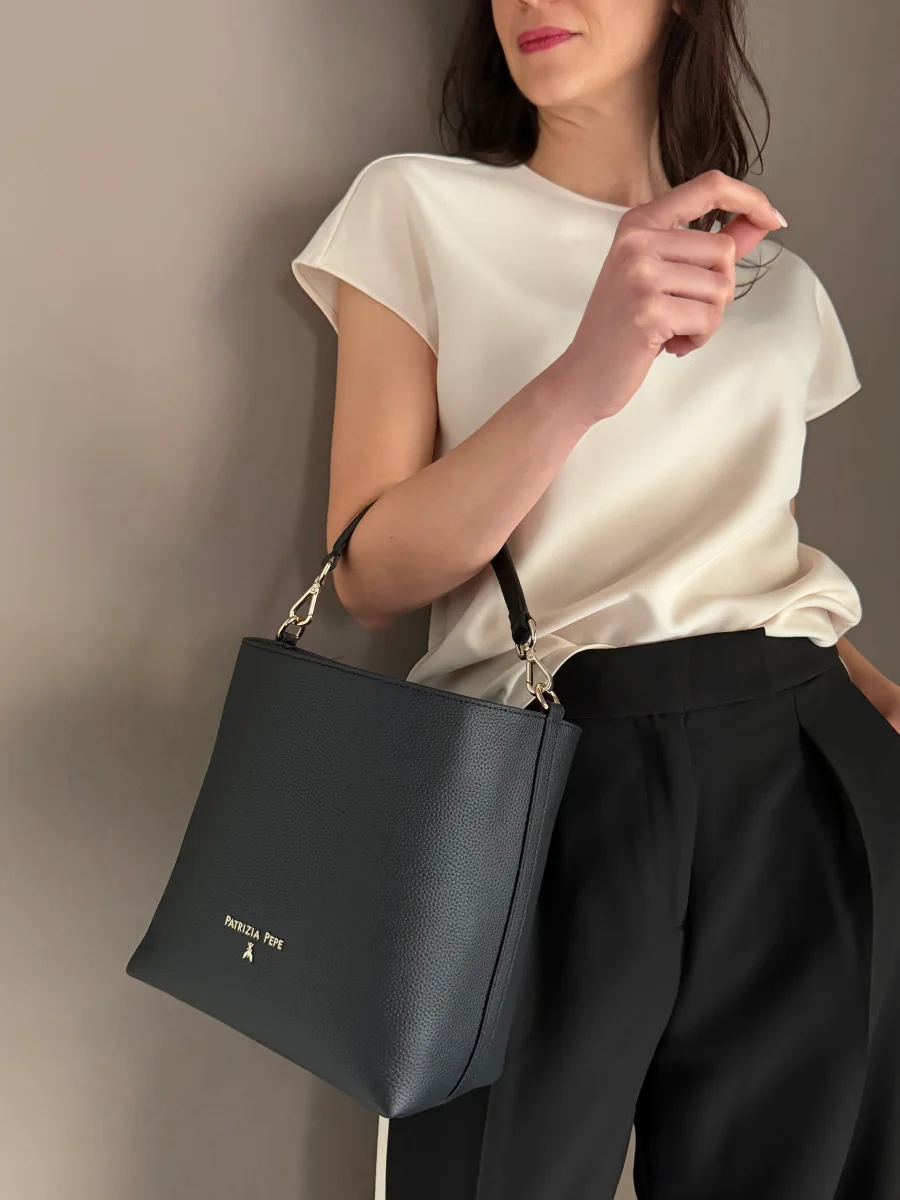 Questa borsa secchiello firmata Patrizia Pepe รจ il perfetto connubio tra design strutturato e praticitร quotidiana. Realizzata interamente in 100% pregiata pelle dalla texture grana naturale, si presenta nella sua veste piรน iconica e intramontabile: il nero profondo.