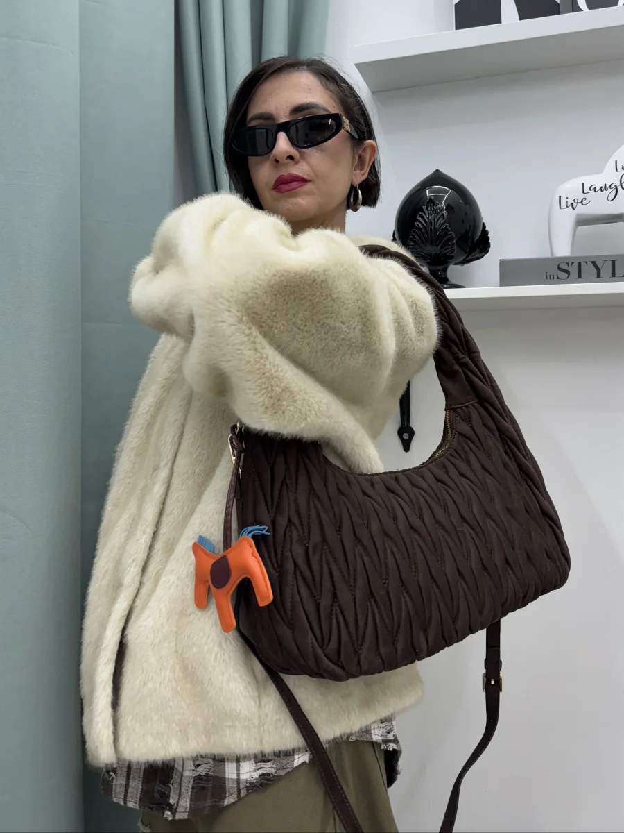 Realizzata in morbida Alcantara effetto scamosciato, è dotata di interno foderato per proteggere i tuoi oggetti personali con stile. La tracolla regolabile e rimovibile offre massima versatilità: portala a spalla, a mano o crossbody, a seconda delle tue esigenze.