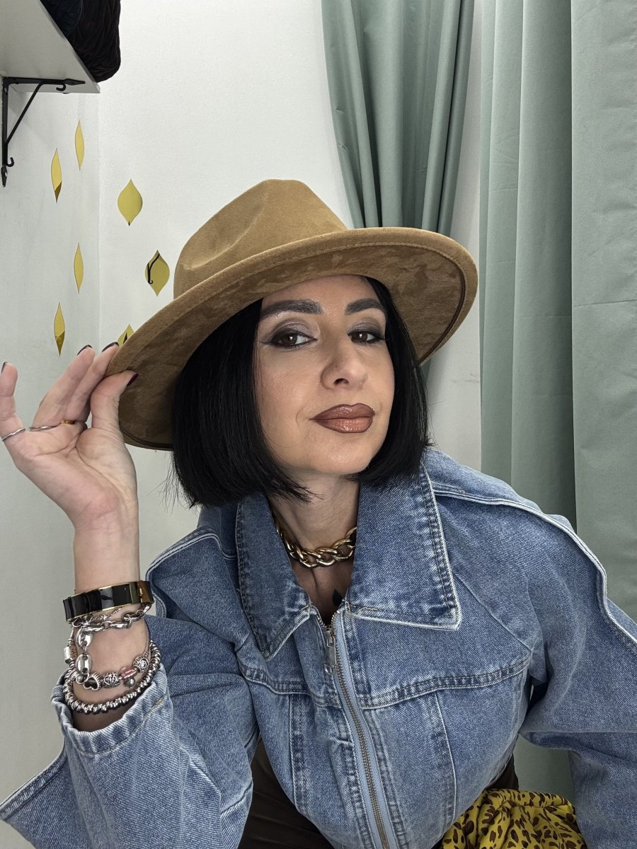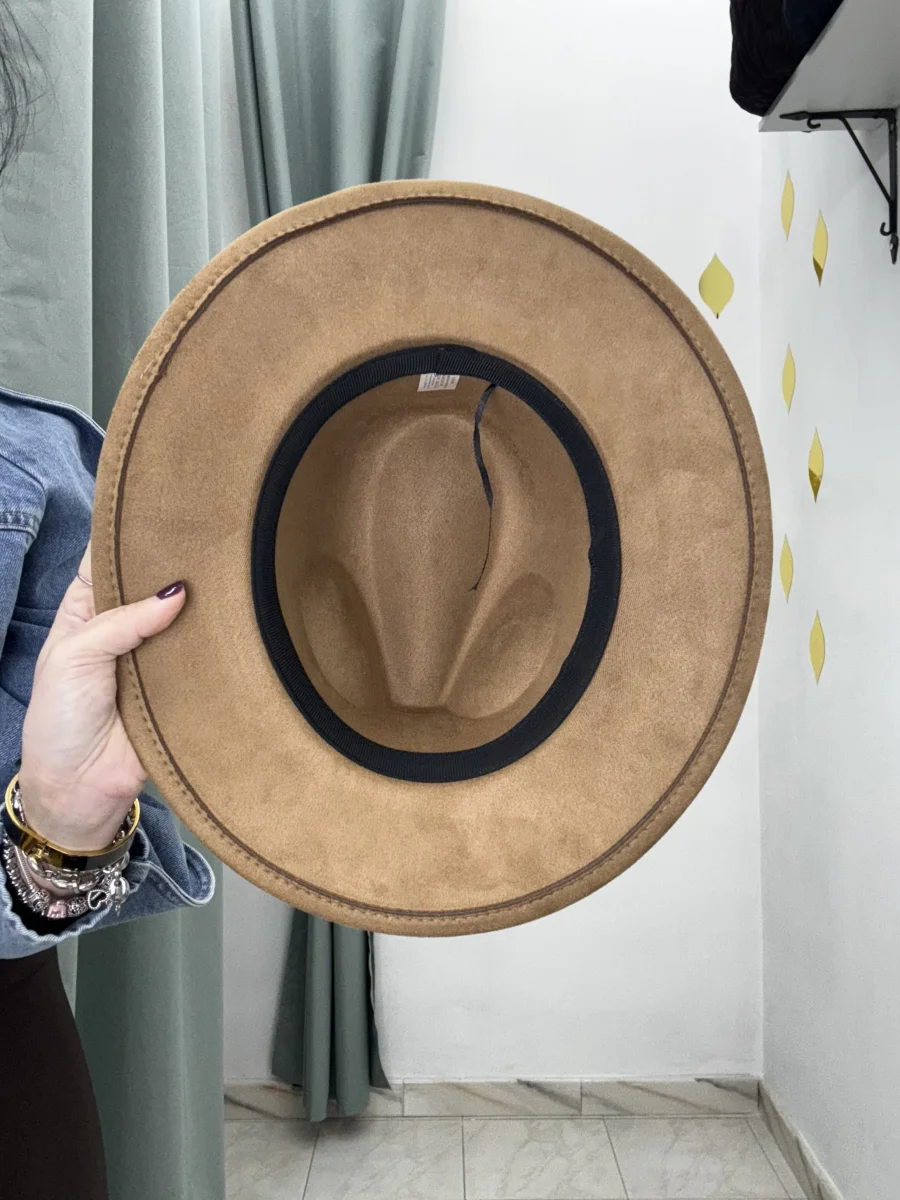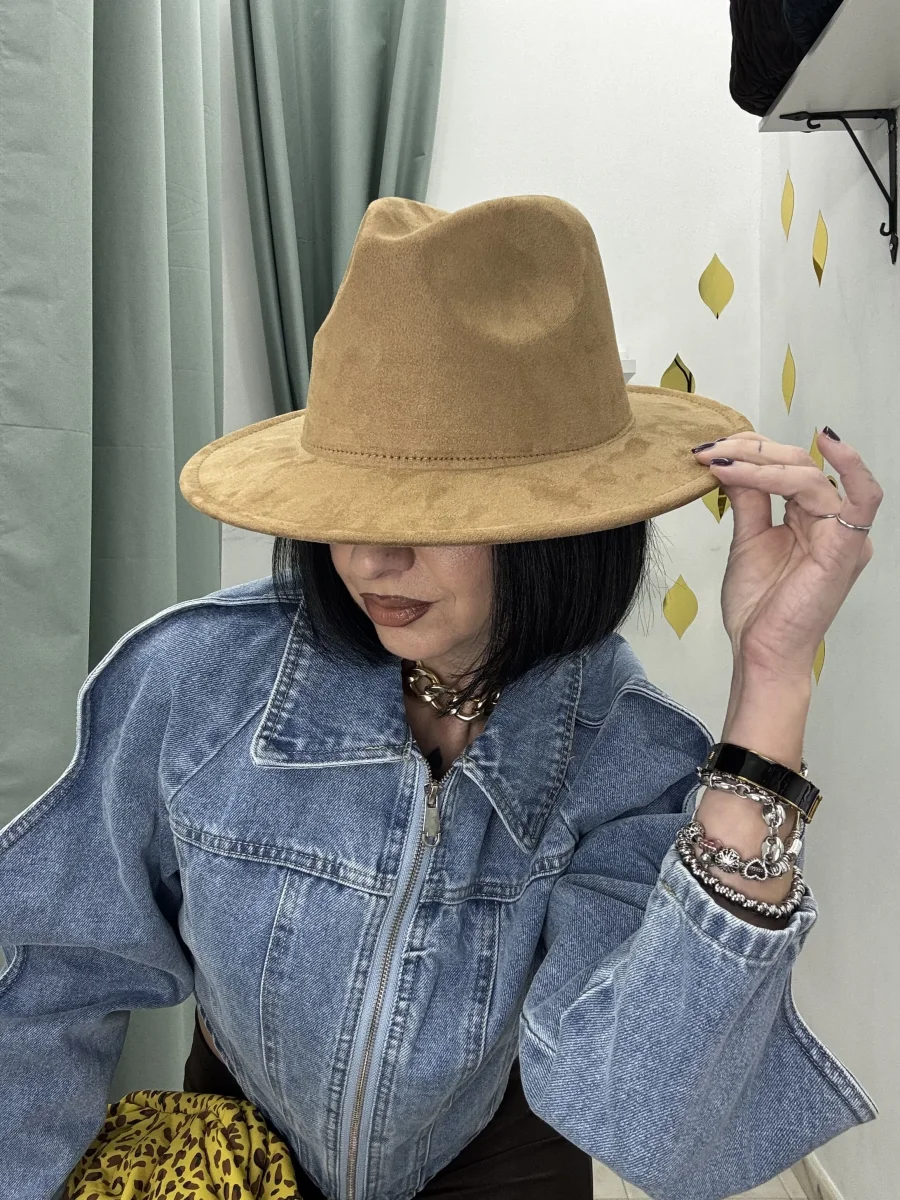 Aggiungi stile e personalità ai tuoi outfit con il cappello modello Fedora jazz in simil camoscio colore cammello, un accessorio elegante e versatile, perfetto per look casual, urban o sofisticati.