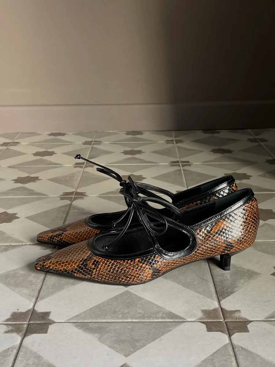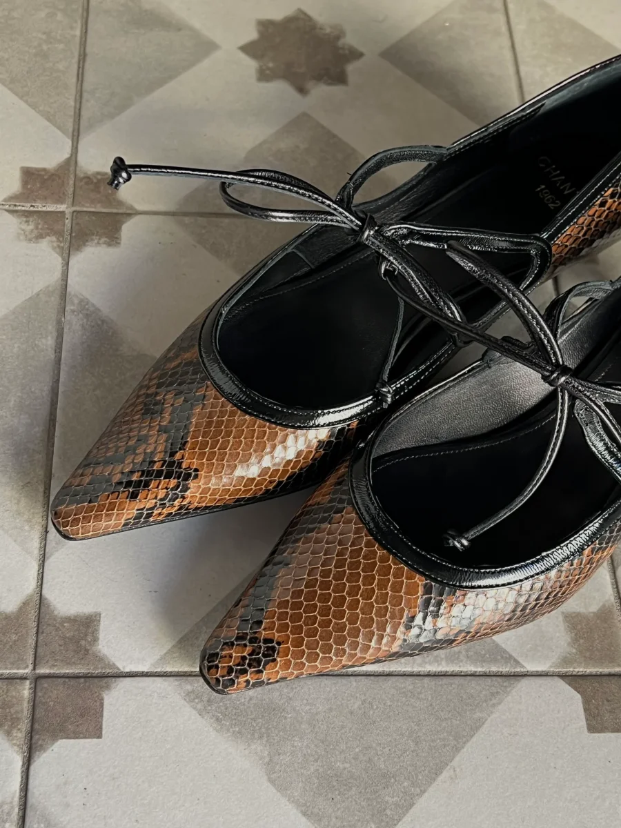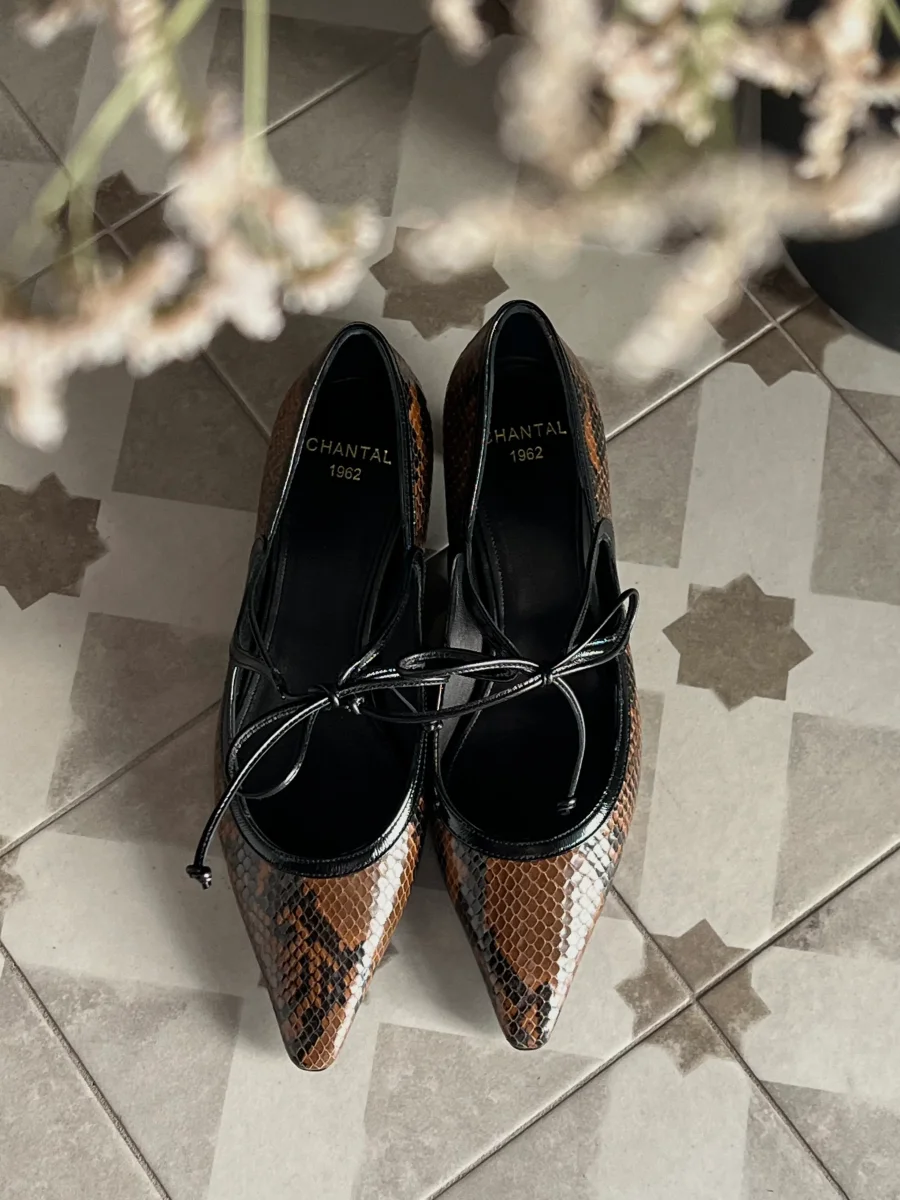 Un connubio perfetto tra eleganza classica e tendenza audace. Le nostre décolleté “Ballet Chic” elevano il tuo look con la loro silhouette affilata, la seducente stampa whipsnake e i raffinati dettagli ispirati alle ballerine.
