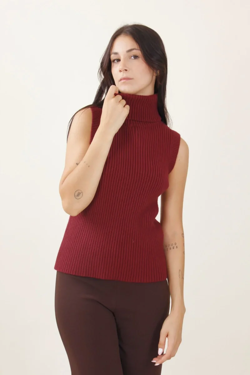 Top dolcevita a collo alto senza maniche, a costine.