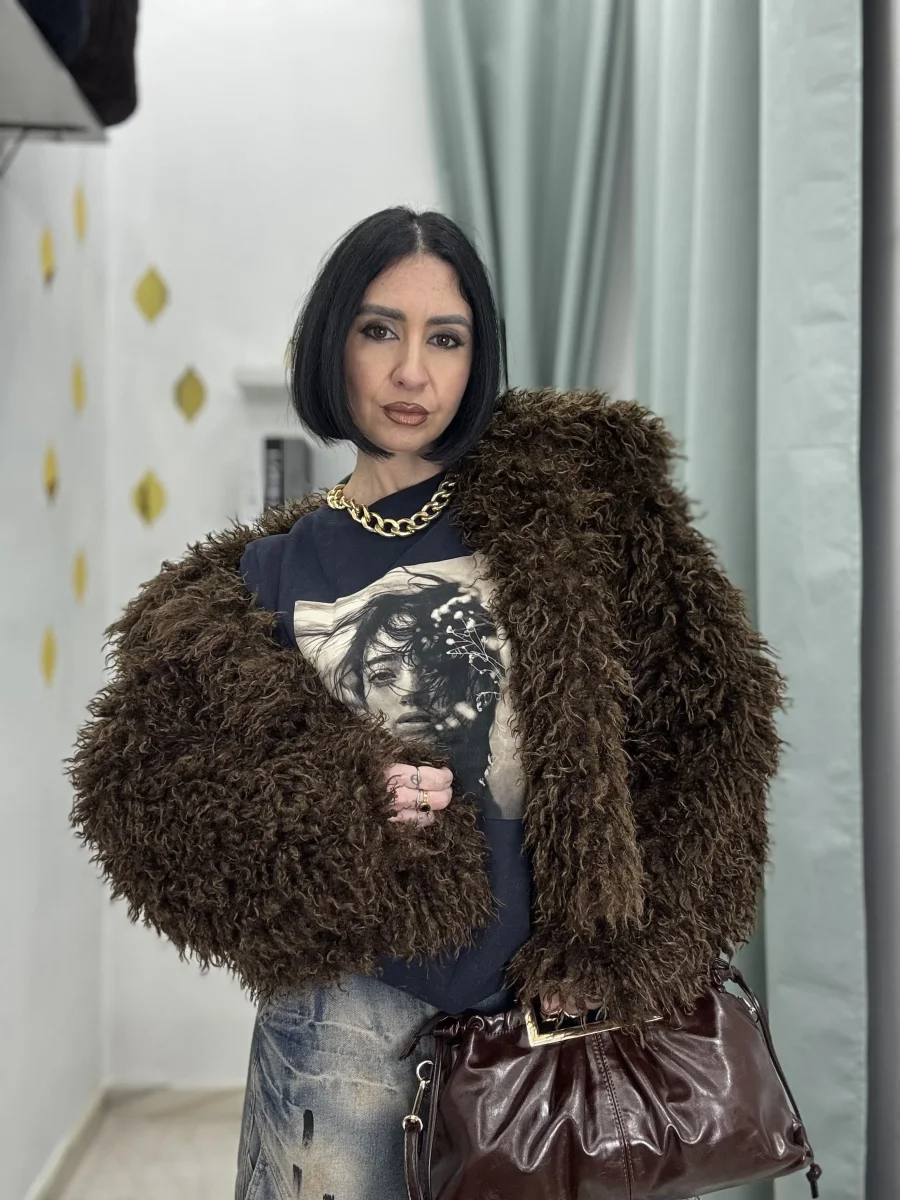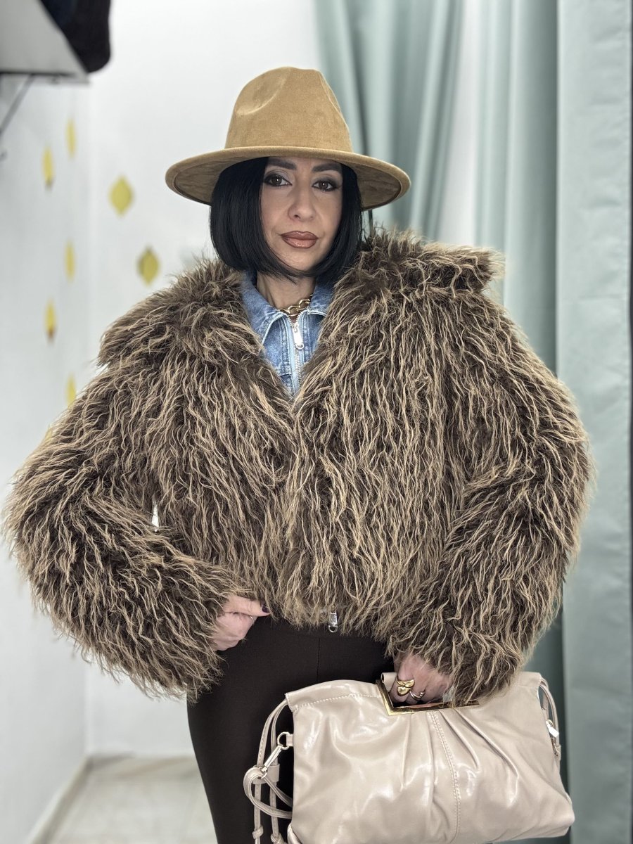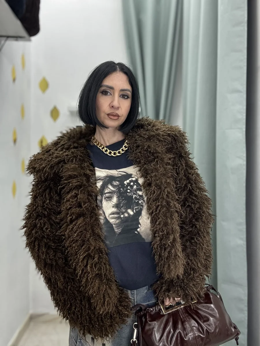 Avvolgente, glamour e perfetta per i mezzi tempi: questa ecofur a pelo riccio e lungo modello crop รจ il capospalla ideale per chi desidera un look sofisticato ma versatile.