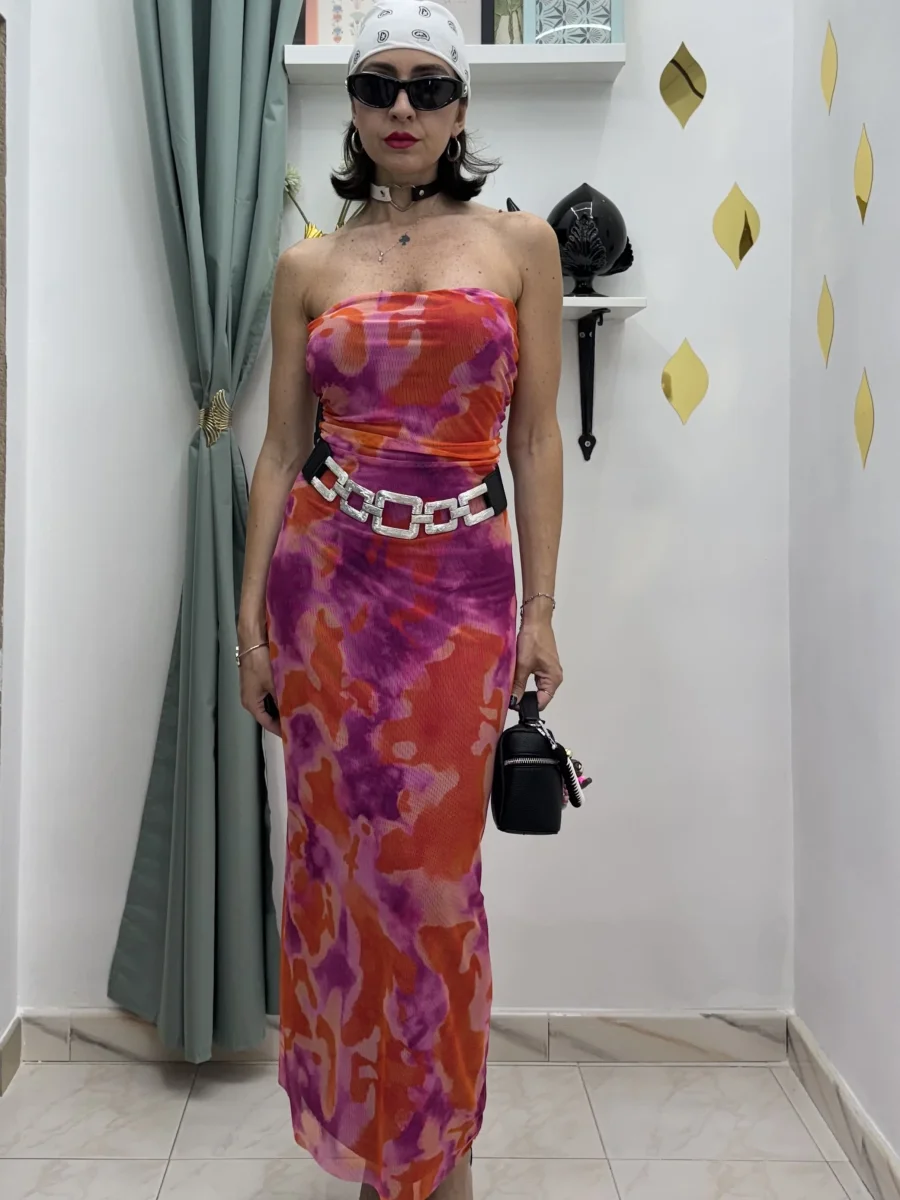 Il motivo multicolore dona un tocco vivace e originale, rendendolo ideale sia per eventi speciali che per serate glamour. Il piccolo spacco posteriore aggiunge una nota di femminilità e comfort nei movimenti, completando un look audace ma raffinato.