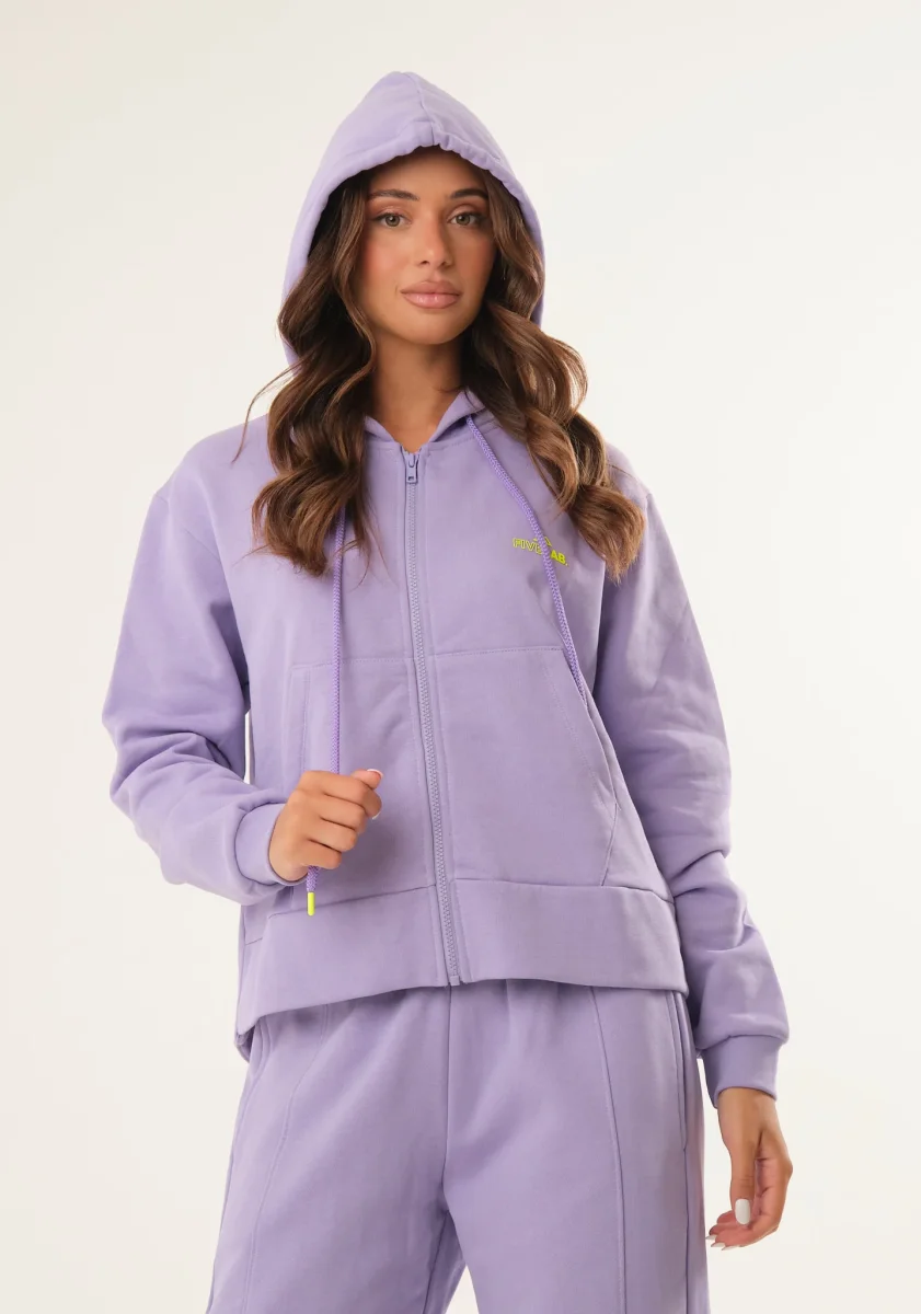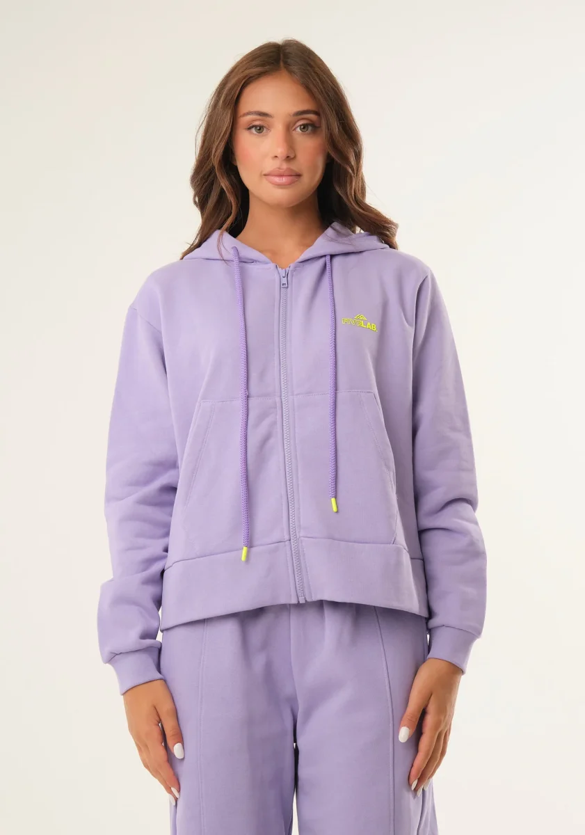 Felpa basic con zip centrale, maniche lunghe, cappuccio fisso con coulisse, tasche laterali, interno garzato