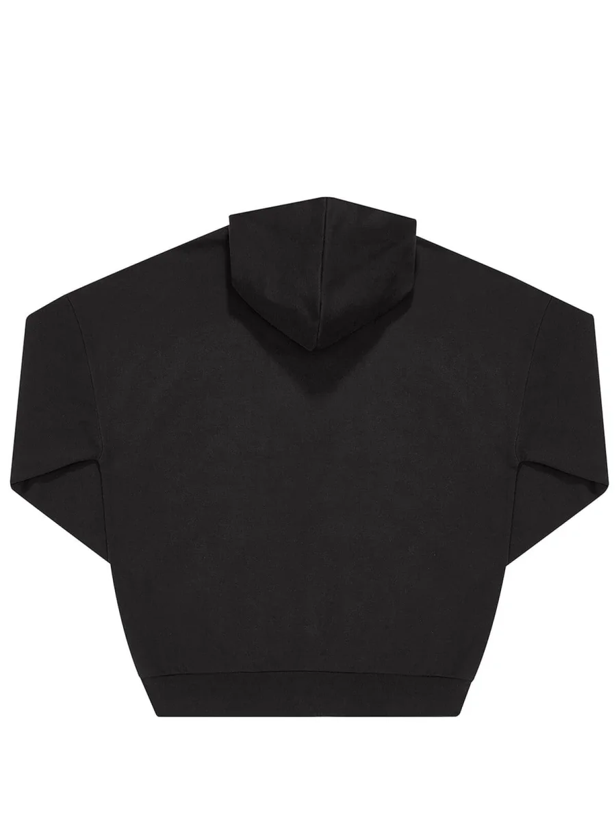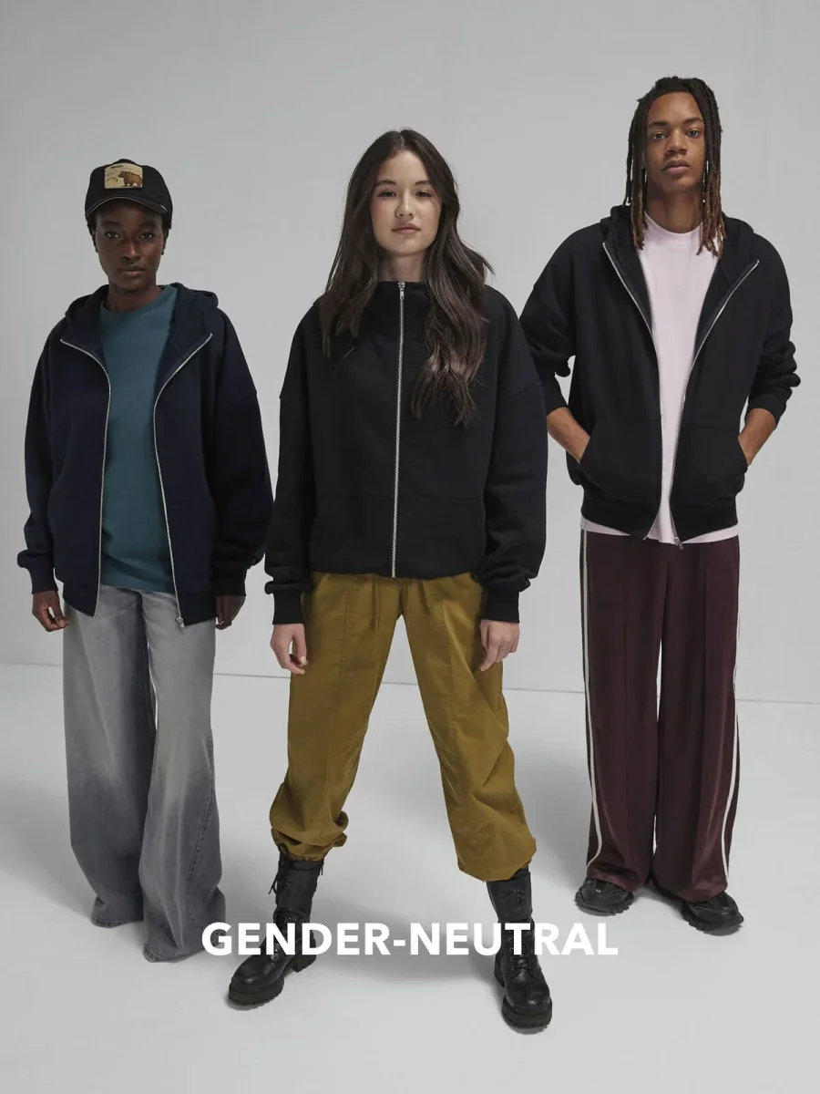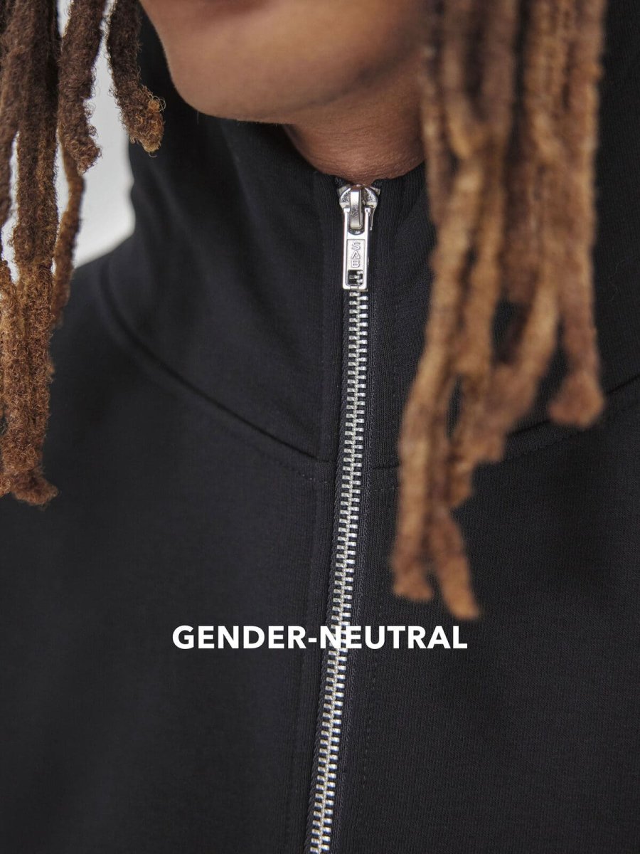 80% cotone 20% poliestere riciclato. Felpa zip e cappuccio, spalle scese e taglio oversize, gender-neutral, colletto alto, tessuto PST, felpata internamente, cappuccio foderato in jersey, senza coulisse, cerniera in metallo.