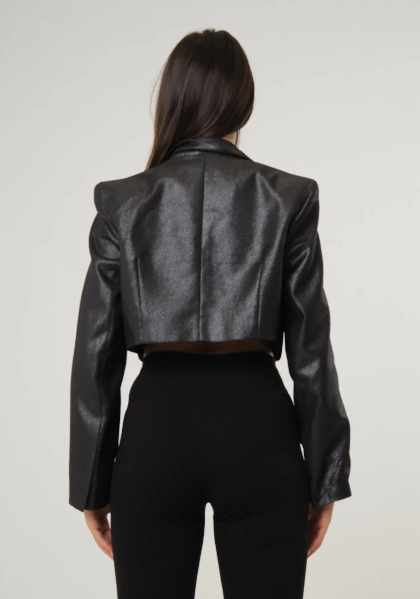 Giacca crop in tessuto placcato con tasche frontali, colletto classico, scollo a V, maniche lunghe, chiusura frontale con bottone a pressione, fodera e spalline interne