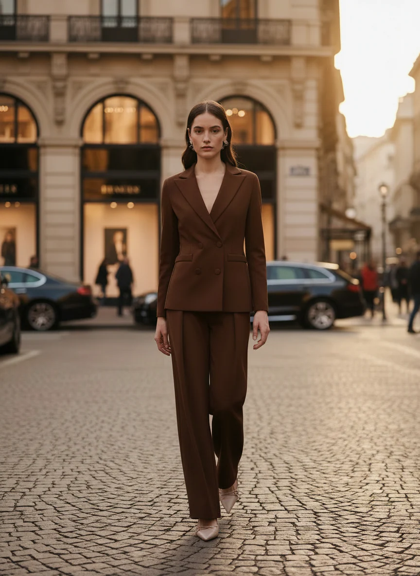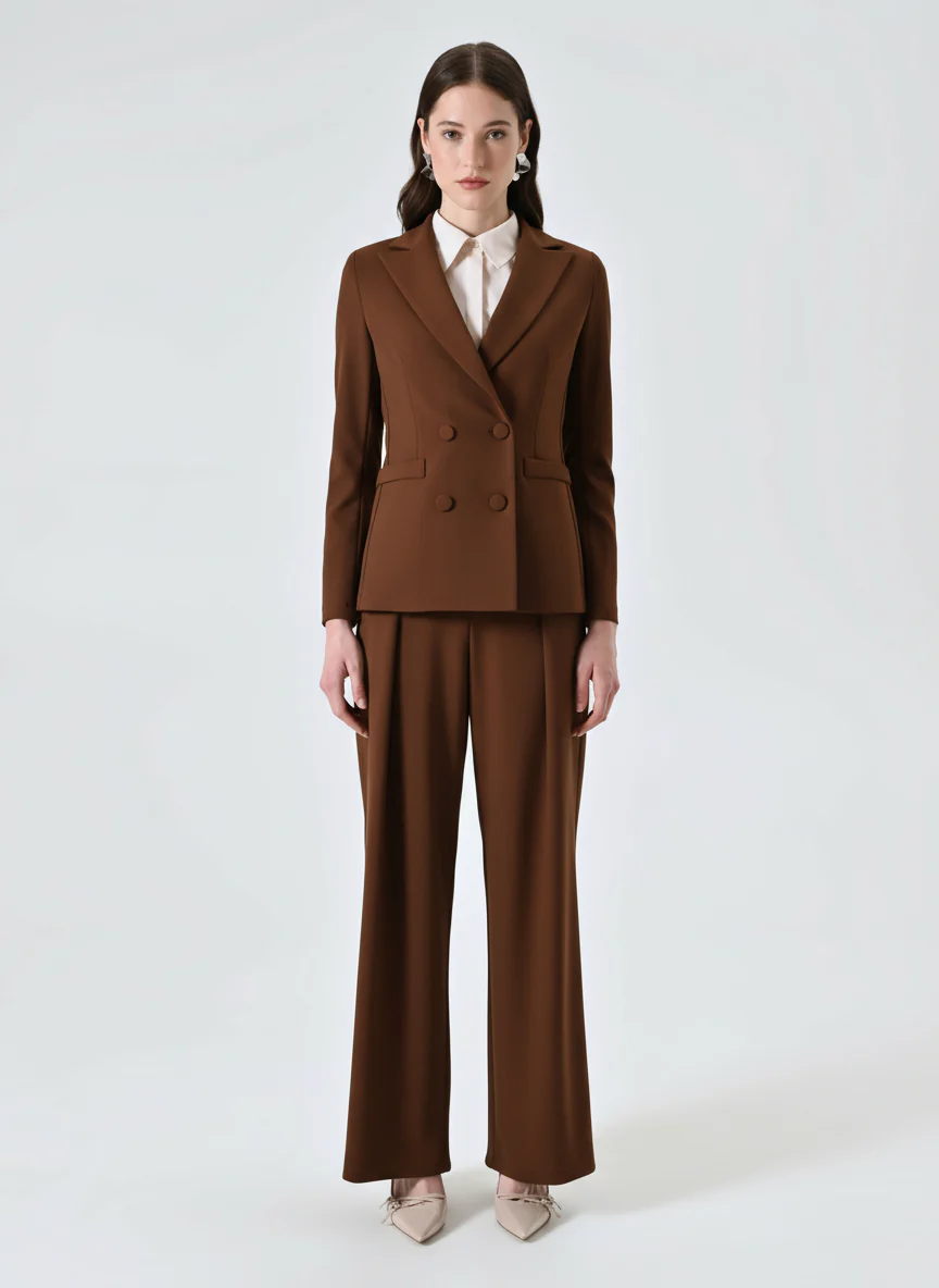 La Giacca Doppiopetto in Scuba Mano Crepe si abbina ai PANTALONI PALAZZO IN SCUBA MANO CREPE, DELLO STESSO COLORE E TESSUTO.