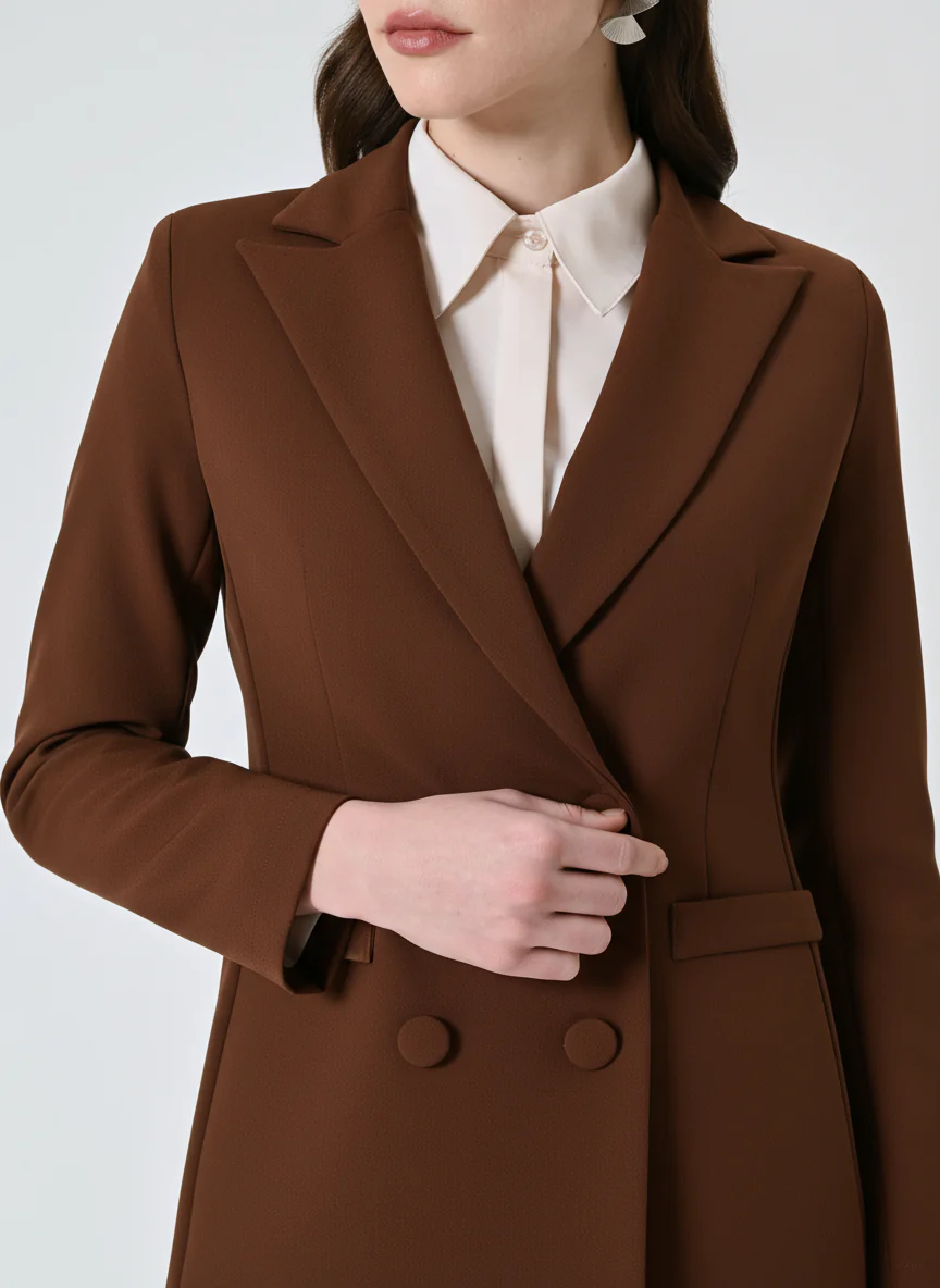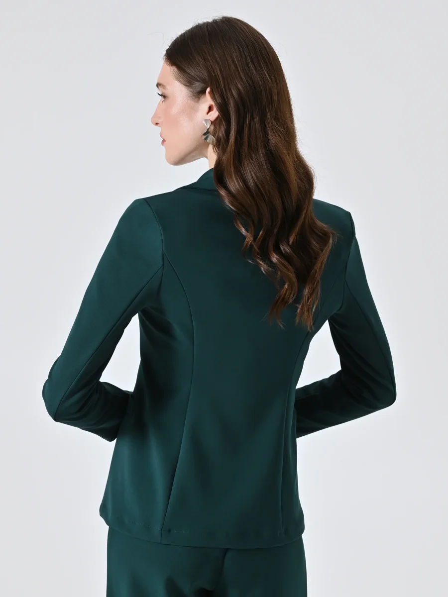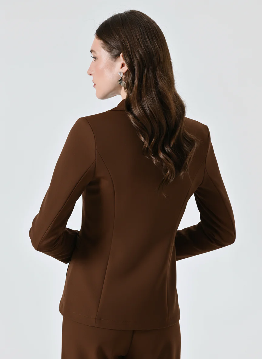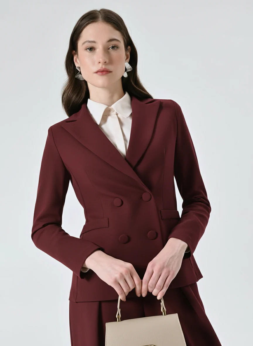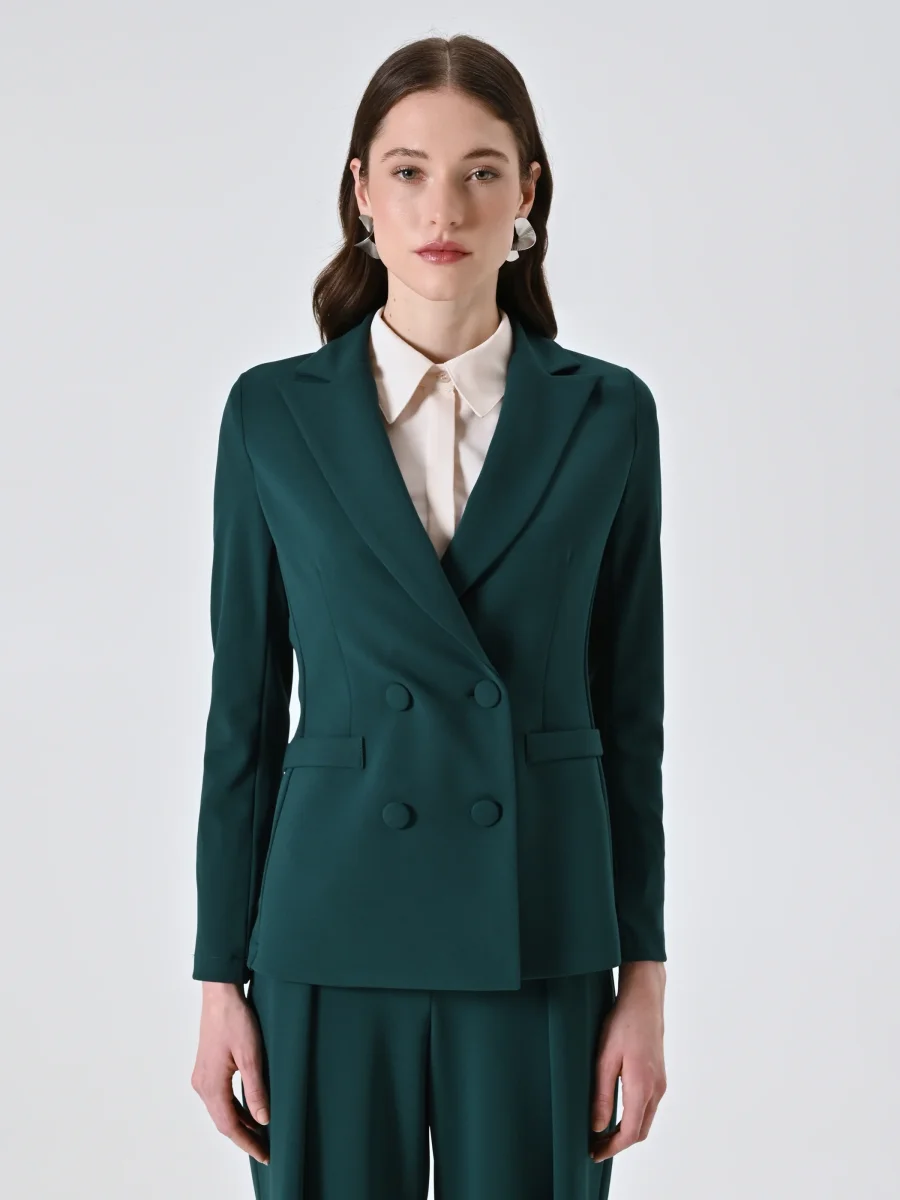 La Giacca Doppiopetto in Scuba Mano Crepe รจ una proposta dal design deciso e femminile, ideale per completare con stile i look da ufficio.