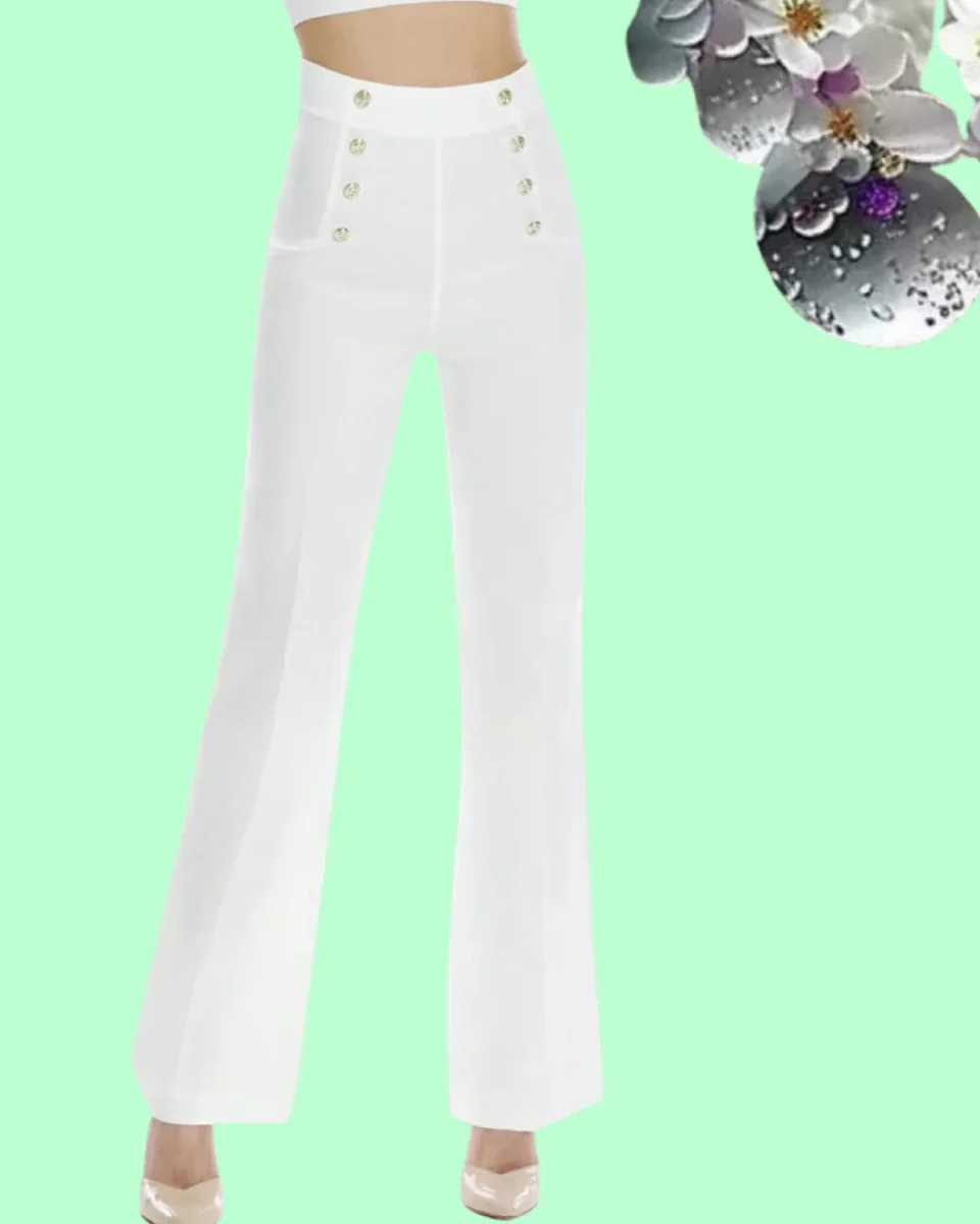 I pantaloni F735 da abbinare alla giacca per creare un tailleur hanno la gamba che si allarga al fondo e la vita alta, arricchiti da una doppia fila di bottoni. Abbottonatura laterale e fit asciutto.