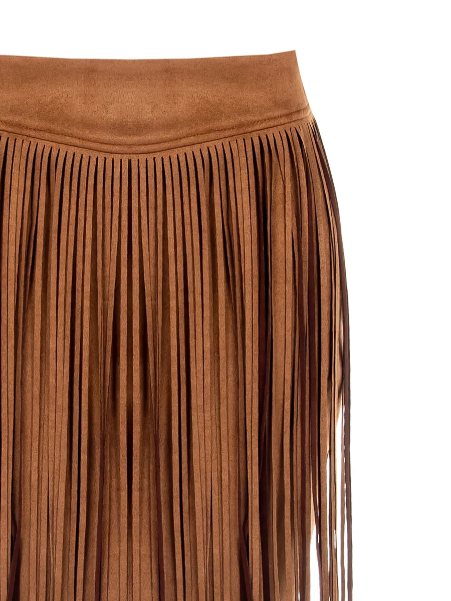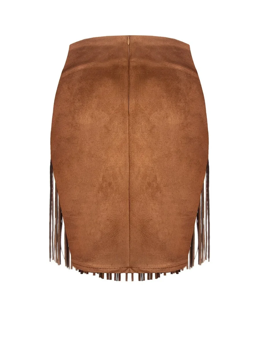 Gonna Mini In Dainetto con Frange. Abbinala alla sua giacca coordinata. La modella รจ alta 1.80 ed indossa una taglia S. Il capo รจ interamente made in italy.